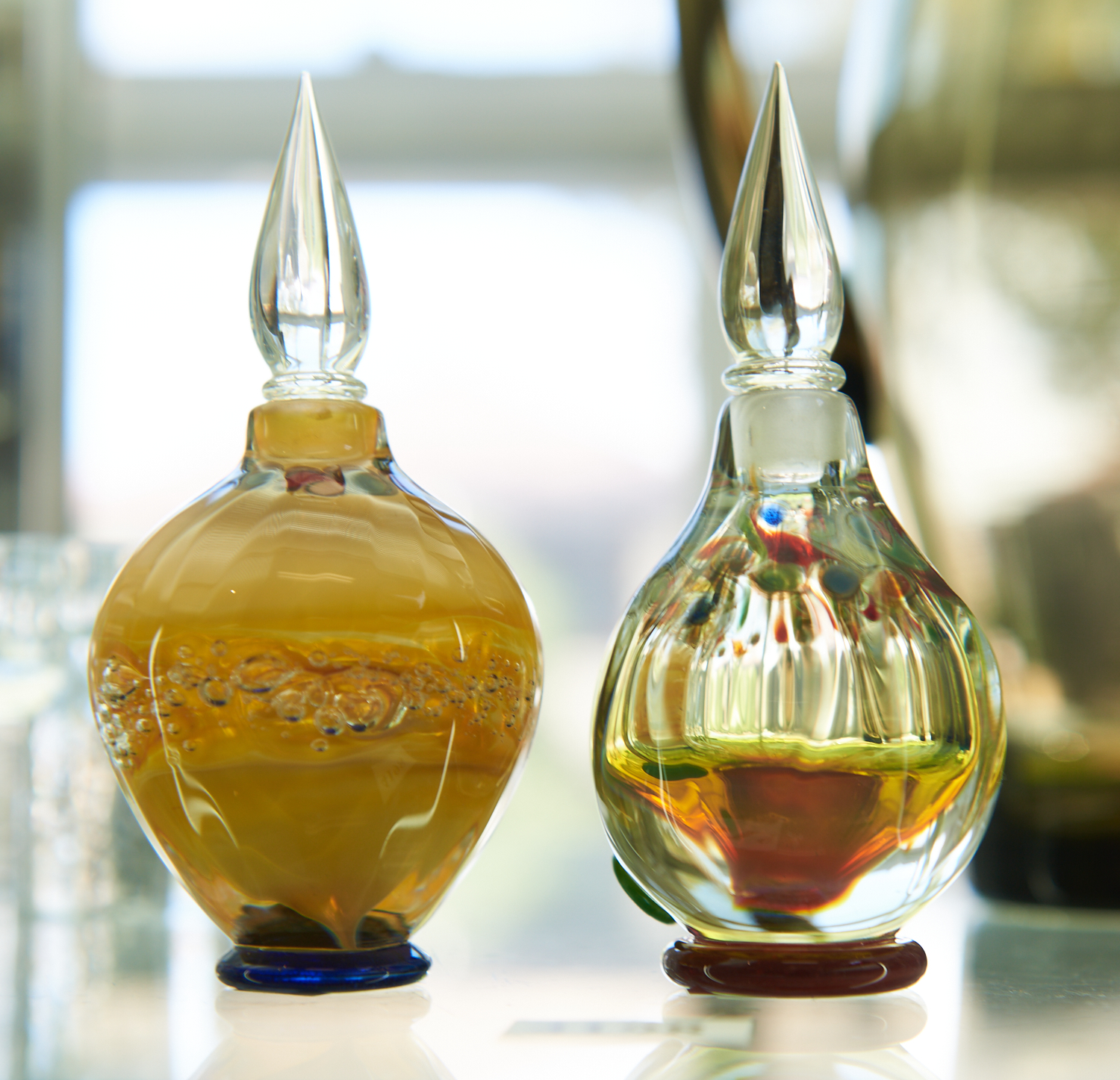 TWO RICHARD CLEMENTS ART GLASS PERFUME BOTTLES WITH MULTICOLOURED DECORATION TO COLLAR H.11.2CM AND 11CM, LEONARD JOEL LOCAL DELIVERY SIZE: SMALL