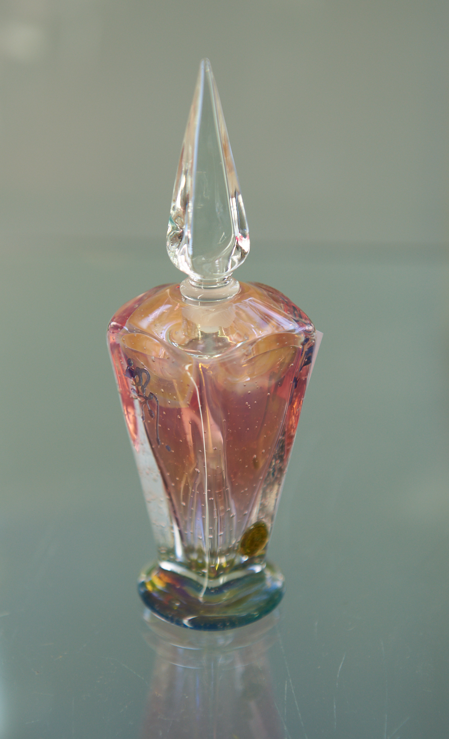 A RICHARD CLEMENTS ART GLASS PERFUME BOTTLE IN SHADES OF PINK WITH AIR BUBBLE DECORATION H.12.9CM, LEONARD JOEL LOCAL DELIVERY SIZE: SMALL