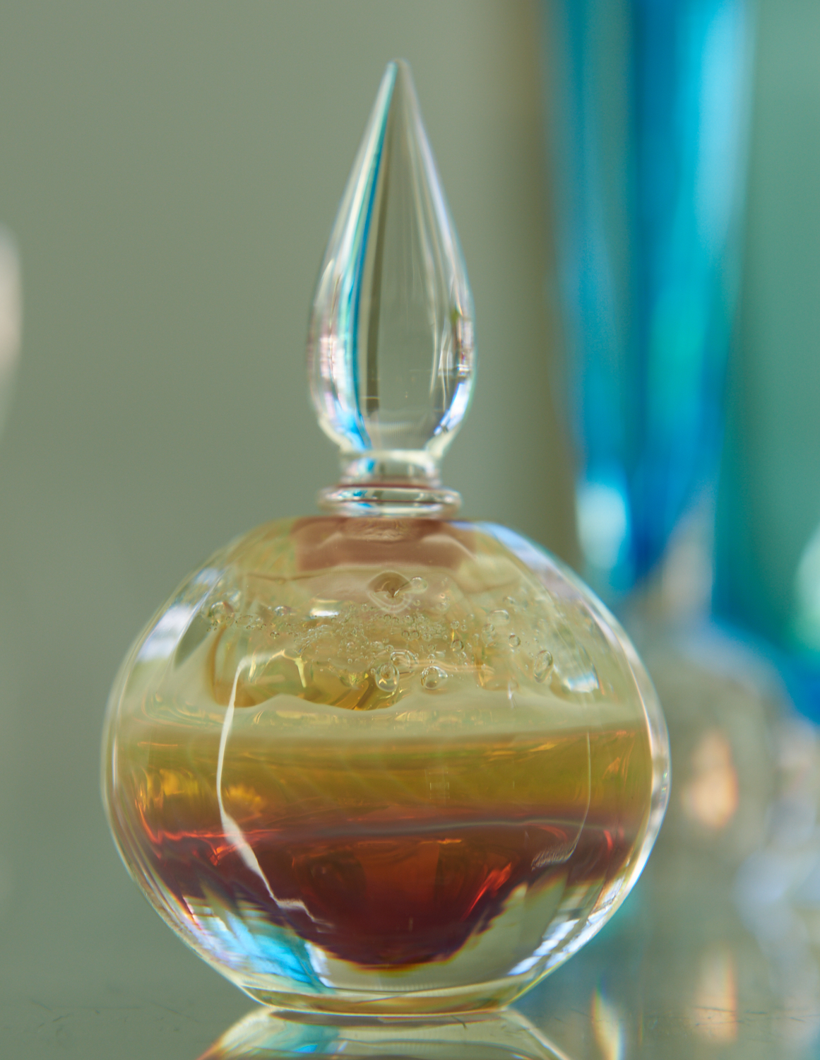 A RICHARD CLEMENTS ART GLASS PERFUME BOTTLE WITH BUBBLE DECORATION AND PINK TONES TO BASE H.9CM, LEONARD JOEL LOCAL DELIVERY SIZE: SMALL