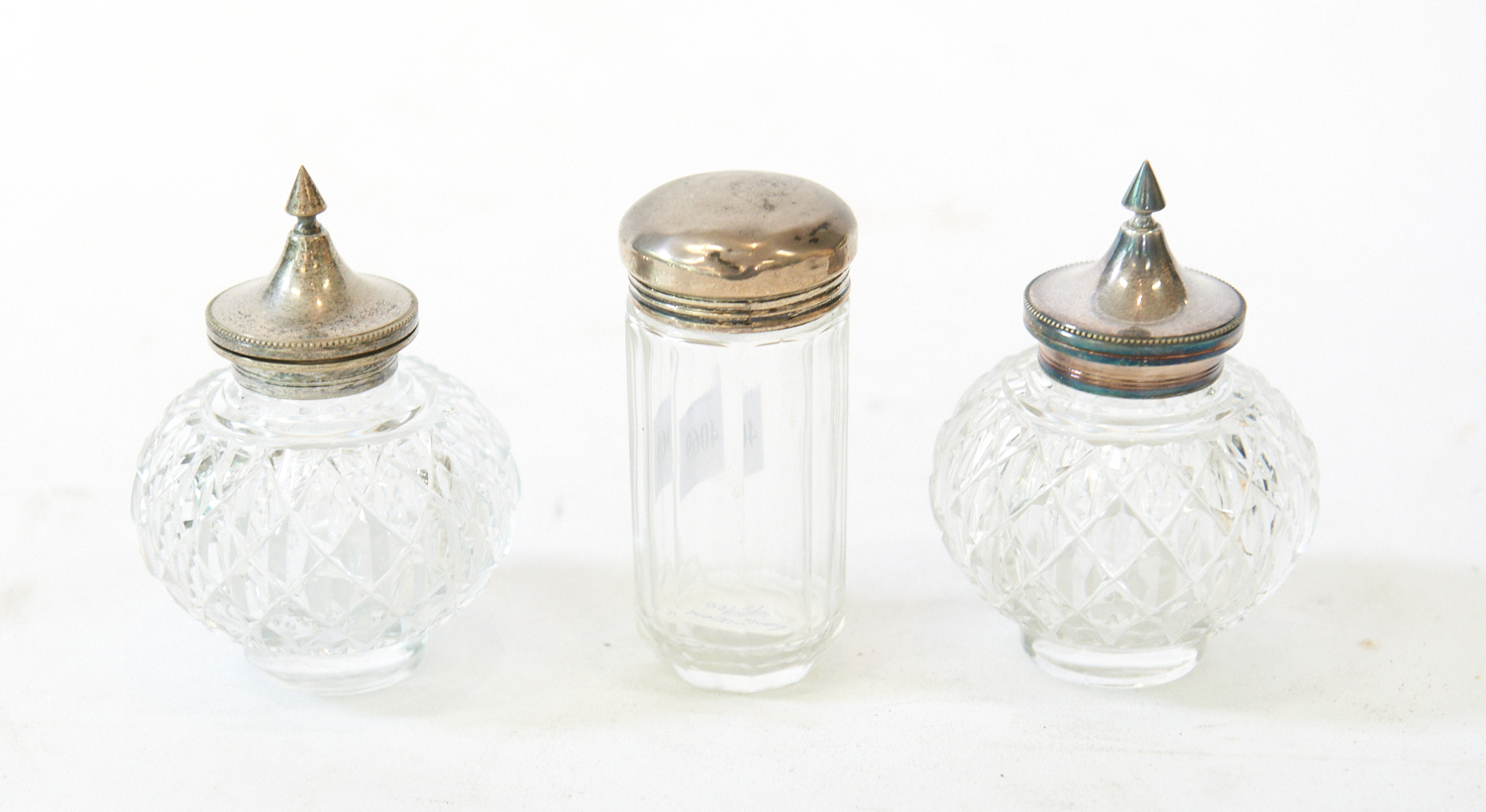 A GROUP OF THREE GLASS VESSELS INCLUDING ONE WITH STERLING SILVER CAP, LEONARD JOEL LOCAL DELIVERY SIZE: SMALL