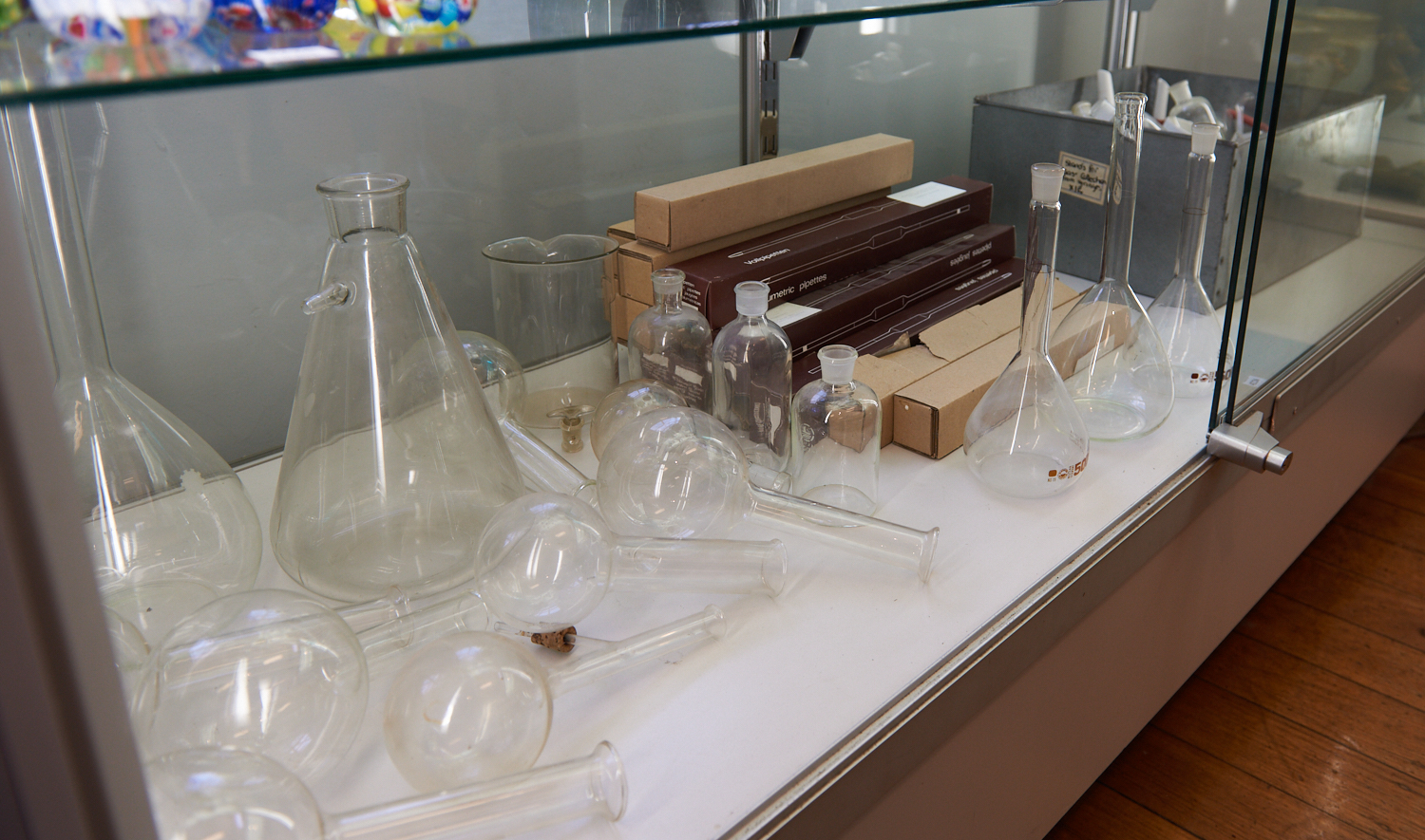 A SHELF OF ASSORTED LAB GLASS, LEONARD JOEL LOCAL DELIVERY SIZE: MEDIUM