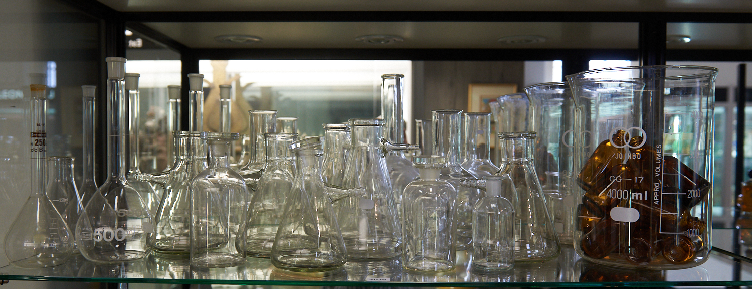 A SHELF OF ASSORTED LAB GLASS, LEONARD JOEL LOCAL DELIVERY SIZE: MEDIUM