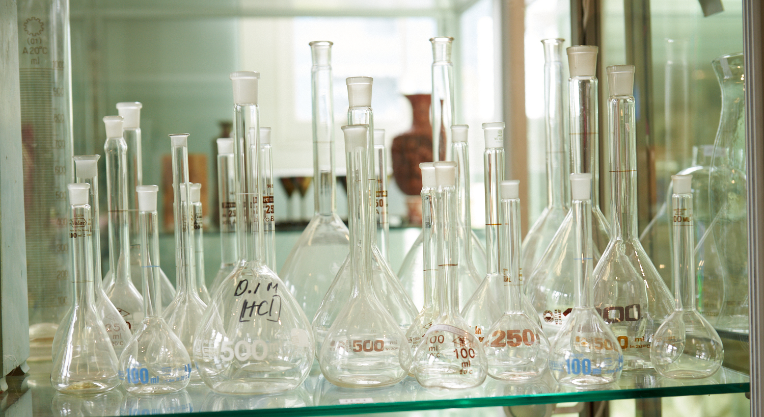 A SHELF OF ASSORTED LAB GLASS, LEONARD JOEL LOCAL DELIVERY SIZE: SMALL