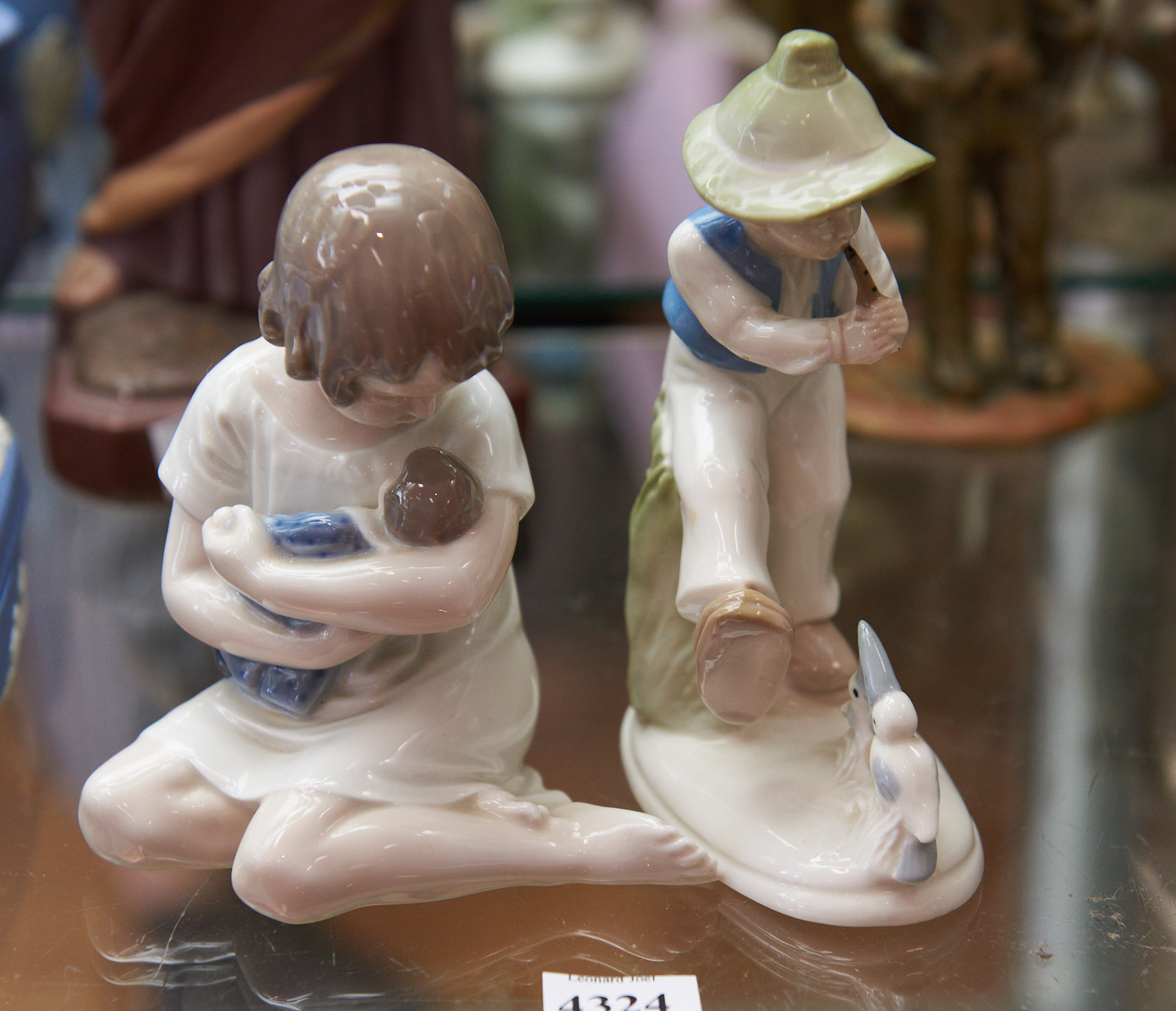 A ROYAL COPENHAGEN FIGURE OF A GIRL WITH CHILD TOGETHER WITH GERMAN PORCELAIN FIGURE OF BOY WITH FLUTE H.15CM, LEONARD JOEL LOCAL DELIVERY SIZE: SMALL