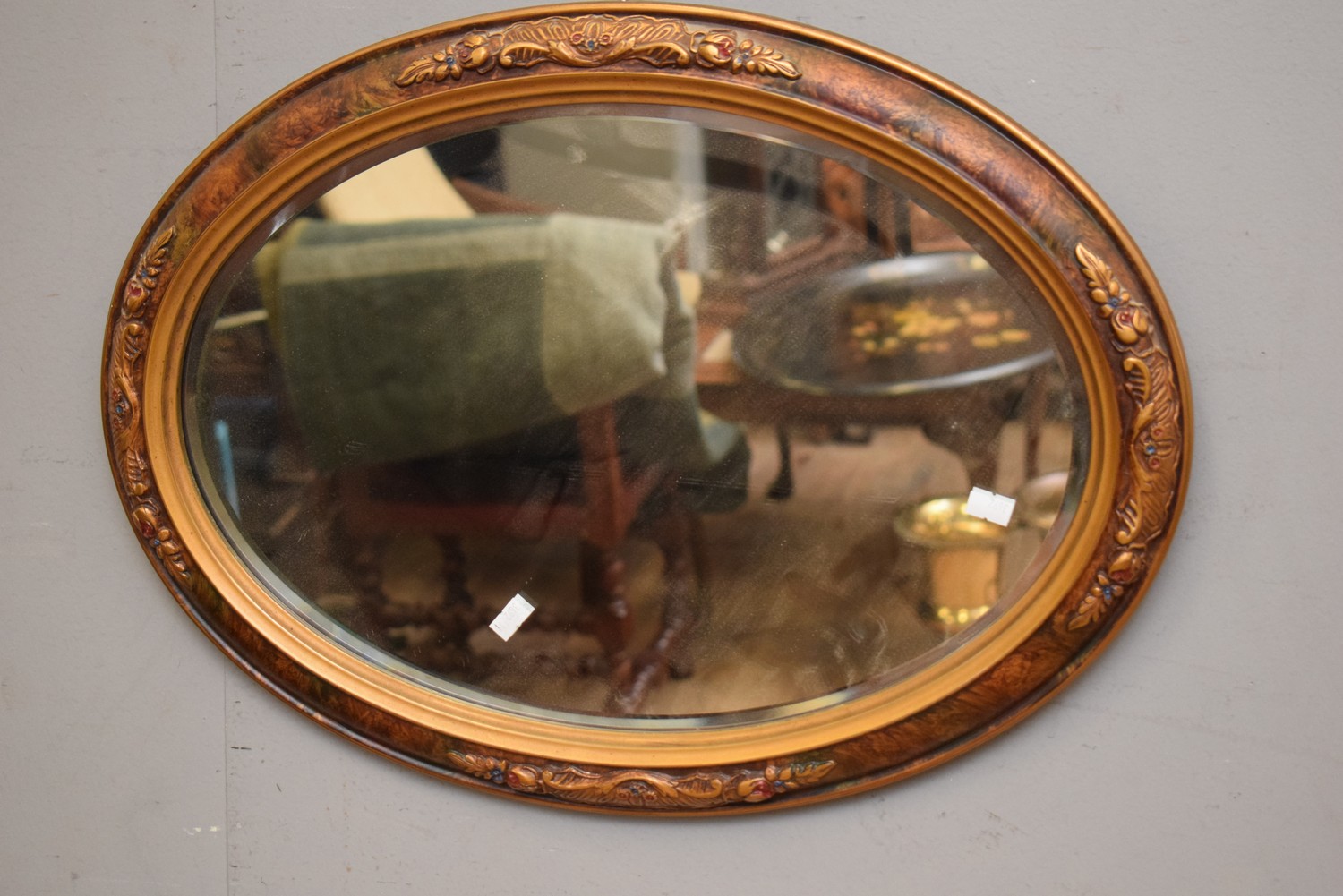 AN OVAL WALL MIRROR WITH DECORATIVE FRAME (42H X 58D CM) (LEONARD JOEL DELIVERY SIZE: SMALL)
