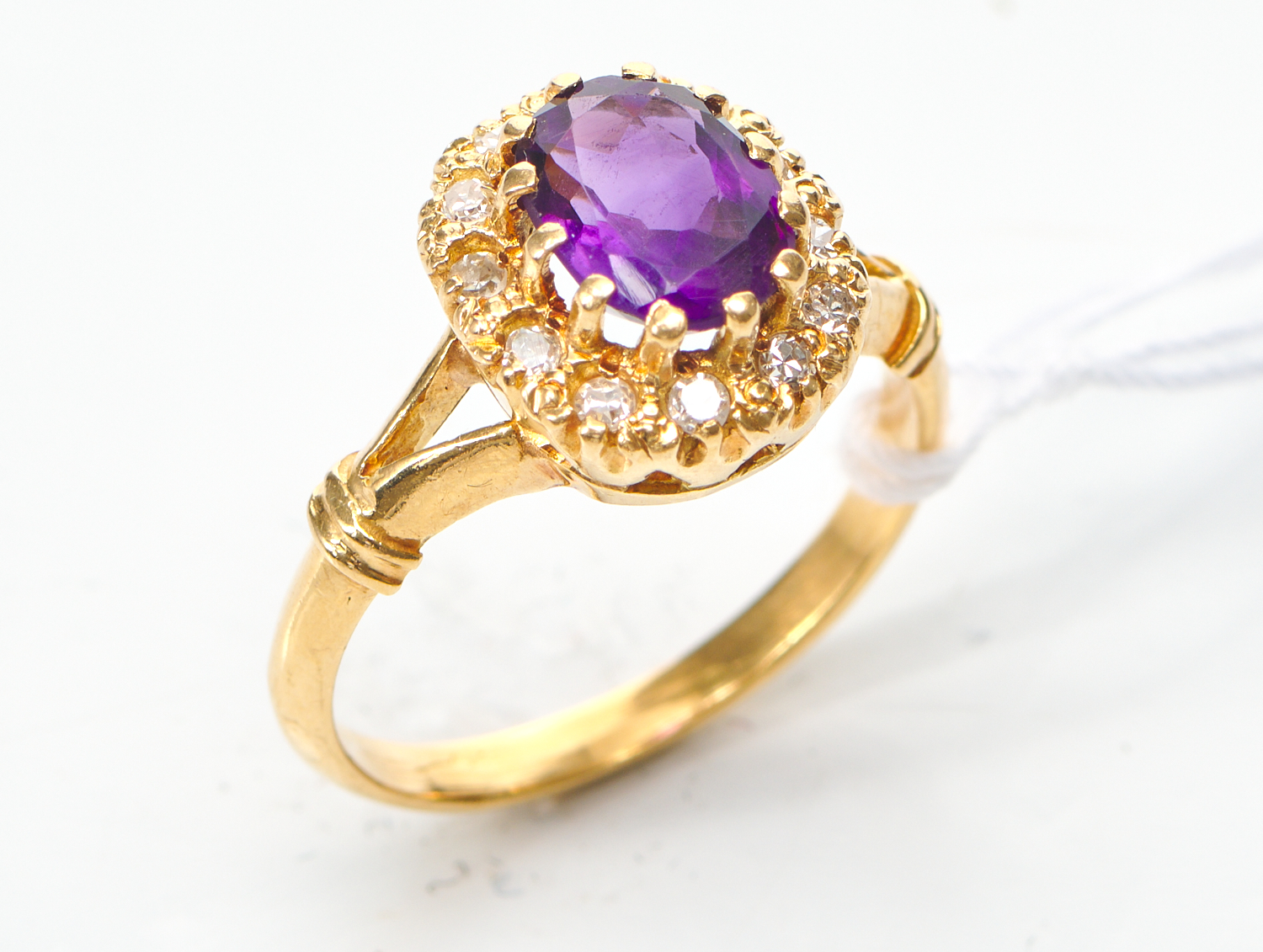 AN AMETHYST AND DIAMOND RING IN 18CT GOLD, FEATURING A CLAW SET OVAL CUT AMETHYST WITH A SURROUND OF ROUND BRILLIANT CUT DIAMONDS, RING SIZE L, 4.3GMS