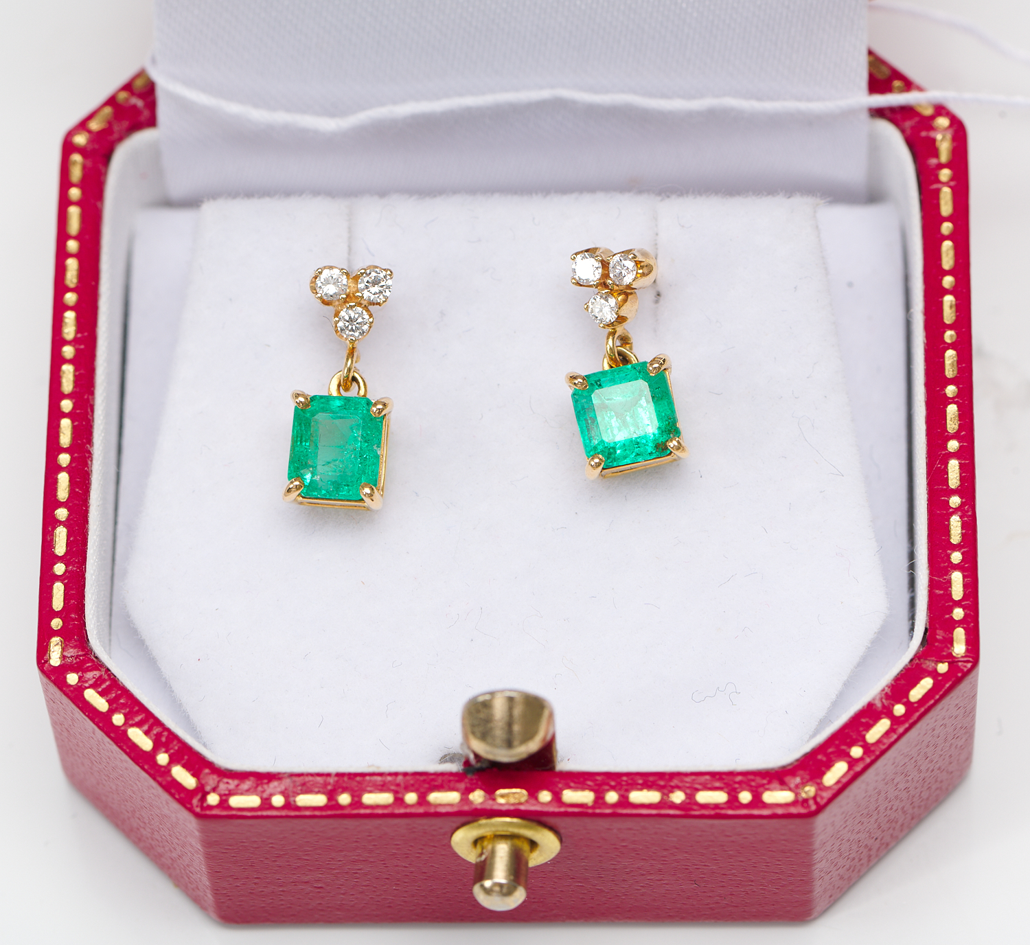 A PAIR OF EMERALD AND DIAMOND EARRINGS IN 18CT GOLD, TO POST AND BUTTERFLY FITTINGS