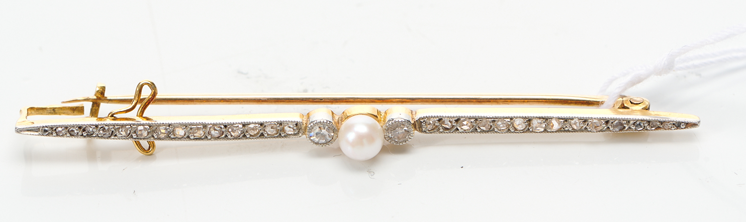 AN ANTIQUE PEARL AND DIAMOND BAR BROOCH IN 14CT GOLD, LENGTH 6CM, 3.2GMS