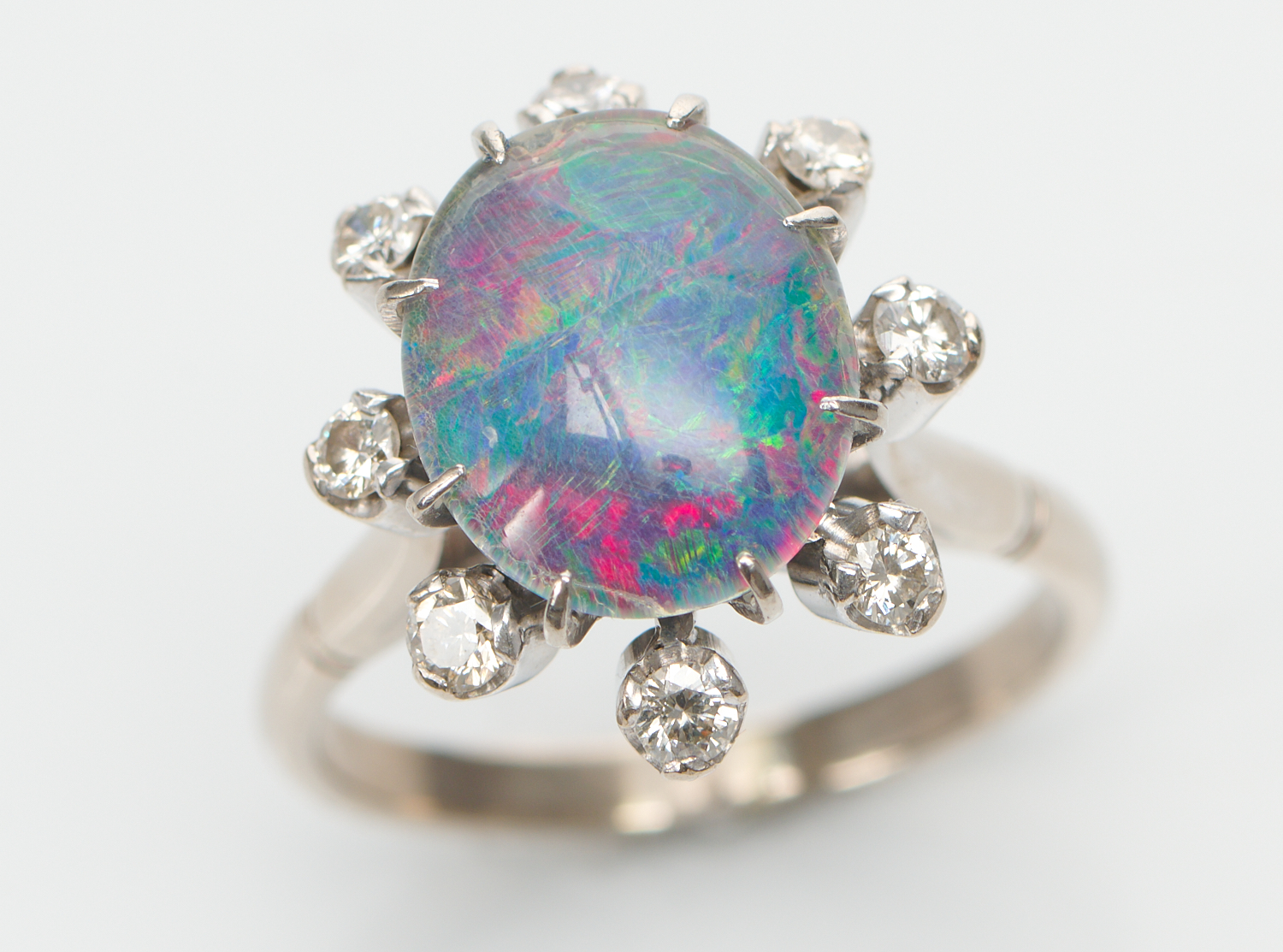 AN OPAL TRIPLET AND DIAMOND CLUSTER RING IN 18CT WHITE GOLD, RING SIZE N/O, 7.4GMS