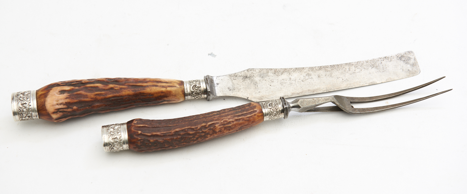 A RED DEER HANDLED CARVING SET WITH STERLING SILVER COLLAR, LEONARD JOEL LOCAL DELIVERY SIZE: SMALL