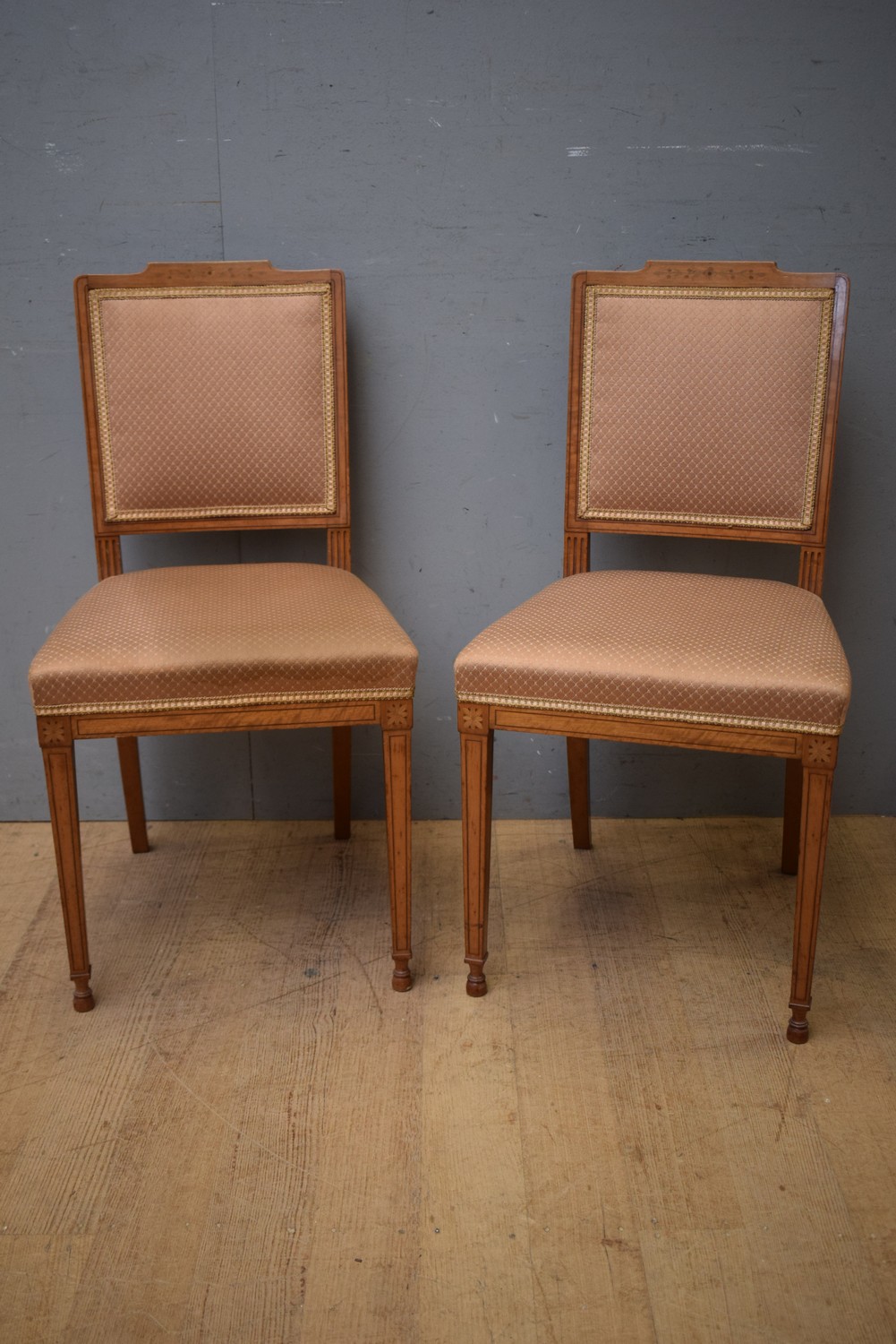 A PAIR OF SCOTTISH SATINWOOD SIDE CHAIRS, STAMPED MORTSON & CO / EDINBURGH / A3798 TO THE SEAT RAIL, IN THE SHERATON STYLE (A/F) (H84 X W44 X D43 CM) (LEONARD JOEL DELIVERY SIZE: MEDIUM). The Estate of Rodney Permezel.