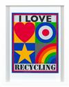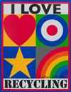 Peter Blake's tin-plate wall sign I Love Recycling blends iconic printmaking with environmental consciousness. Made in collaboration with Creatively Recycled Empire, I Love Recycling was first unveiled at the 2009 National Recycling Awards, held at the Hilton Park Lane.