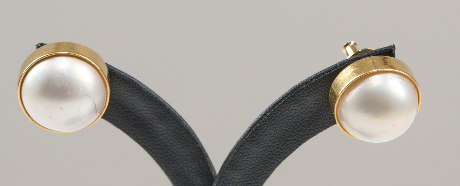 A MABE PEARL SUITE IN 20CT GOLD, COMPRISING OF EARRINGS AND A PENDANT, EARRING DIAMETER 18MM, PENDANT DIAMETER 20MM, TOTAL WEIGHT 23.9 GRAMS