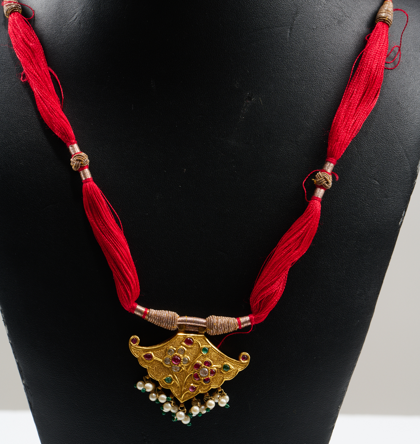 AN INDIAN DIAMOND, RUBY, EMERALD AND PEARL PENDANT IN 20CT GOLD, TO A TWISTED METAL AND SILK NECKLACE, LENGTH 86CM, 26GMS