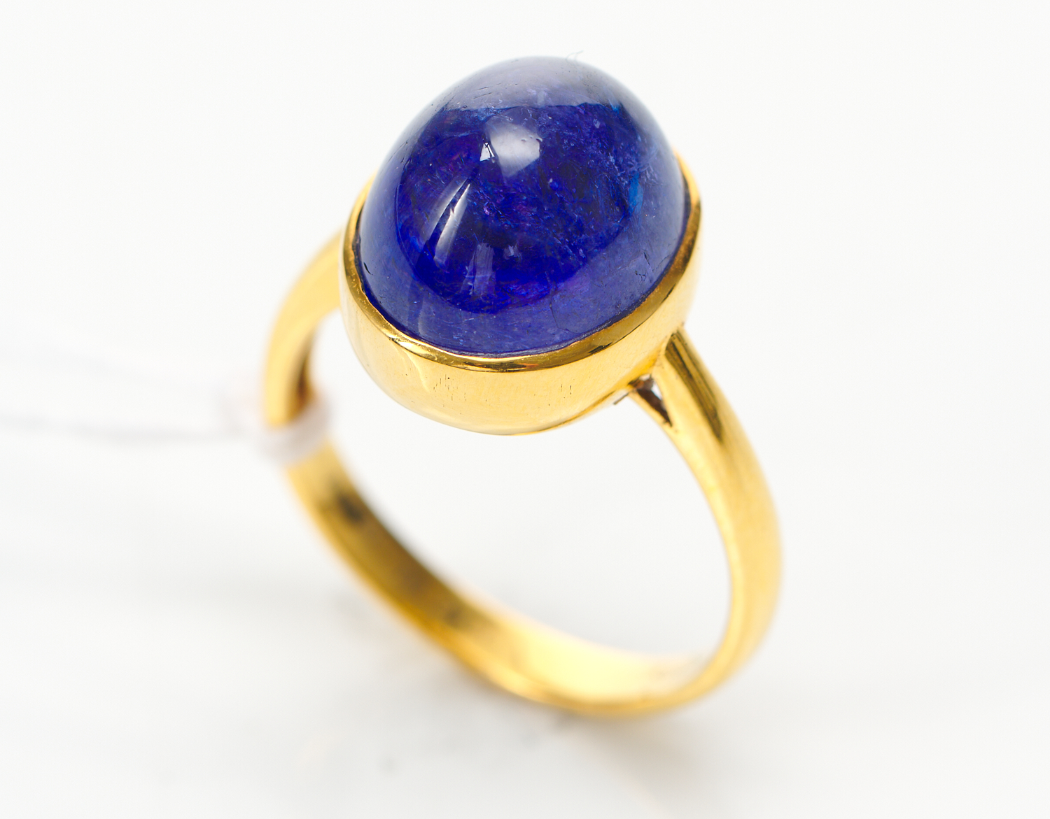 A CABOCHON TANZANITE RING IN 18CT GOLD, RING SIZE: N.