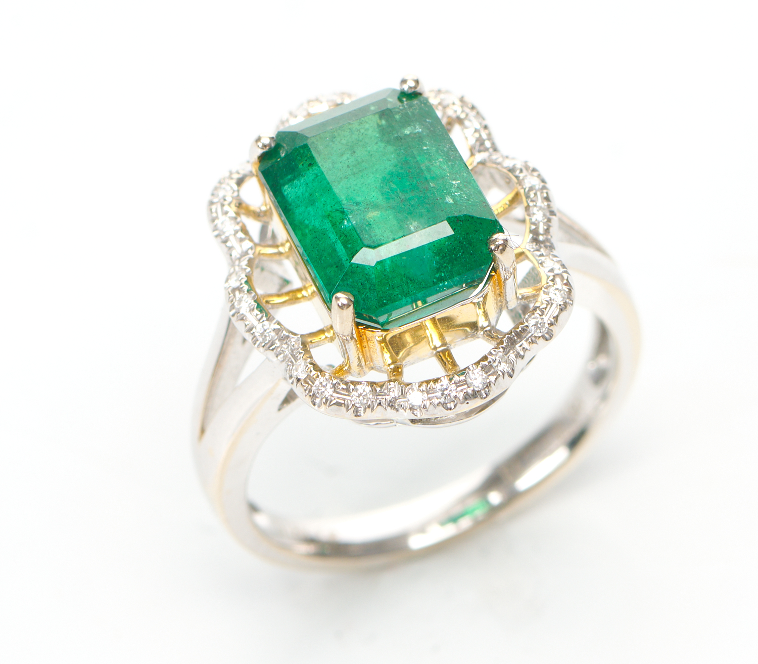 AN EMERALD AND DIAMOND RING IN 18CT WHITE GOLD, EMERALD WEIGHING AN ESTIMATED 4.71CT, DIAMONDS TOTALLING 0.13CT, RING SIZE M1/2