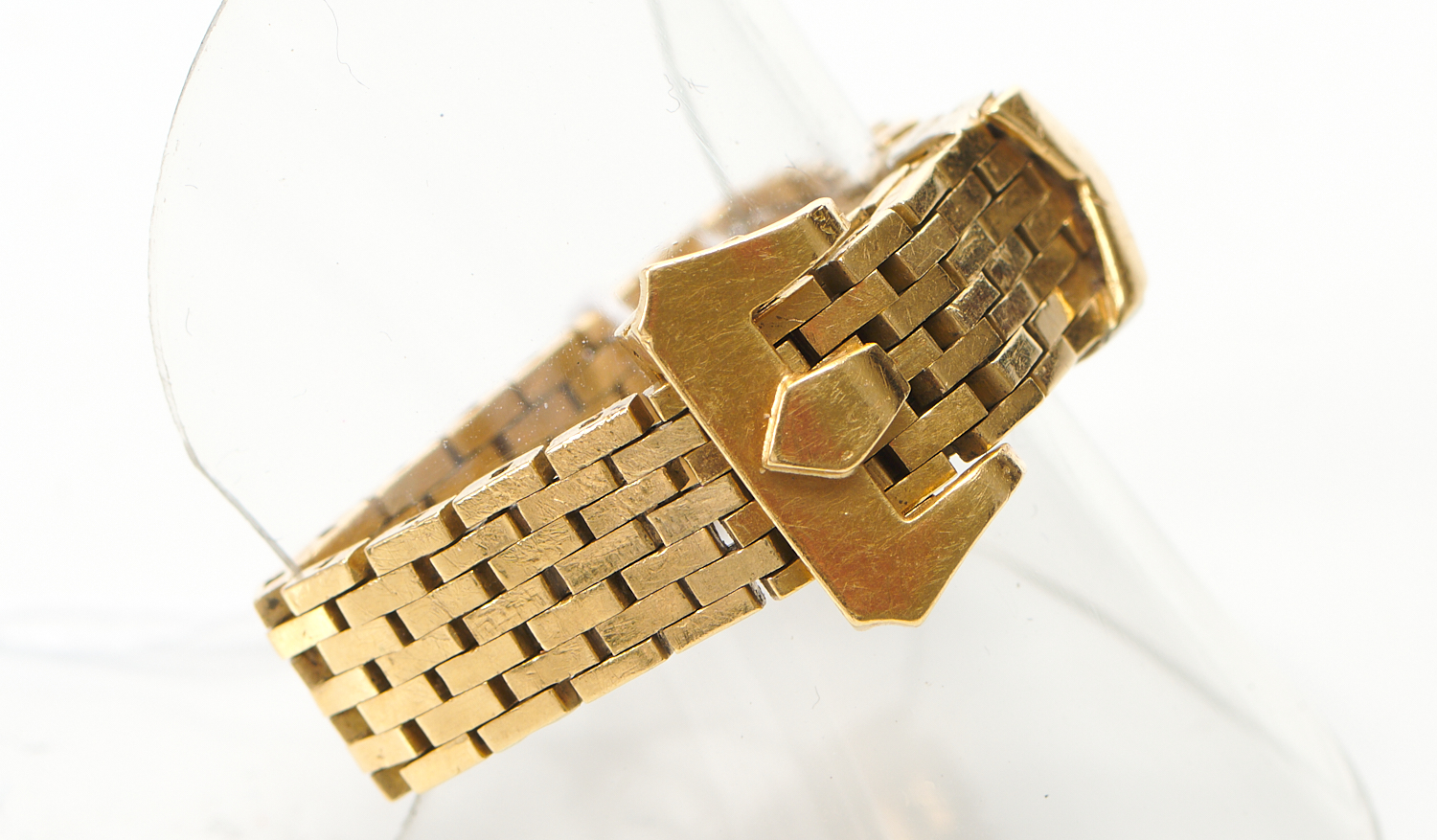 A BUCKLE RING IN 18CT GOLD, RING SIZE P/Q, 8.5GMS