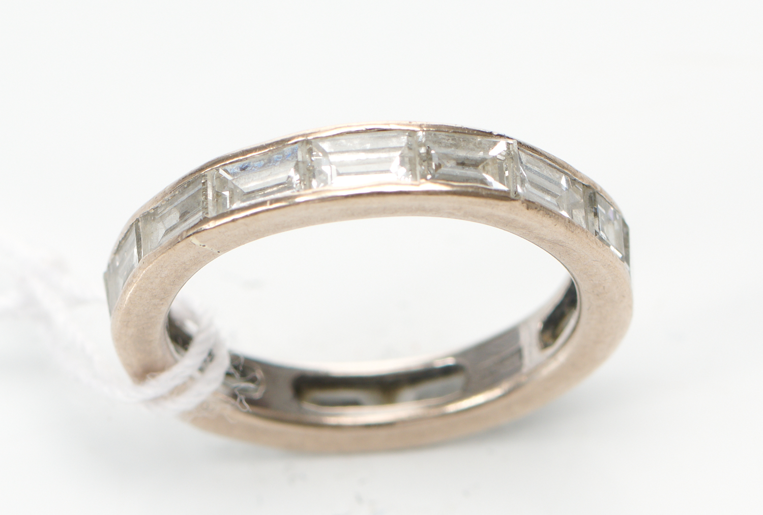 A DIAMOND ETERNITY RING IN 18CT WHITE GOLD, FEATURING CHANNEL SET BAGUETTE CUT DIAMONDS AND ONE PRINCESS CUT DIAMOND, TOTALLING AN ESTIMATED 1.10CTS, RING SIZE K, 3.0GMS