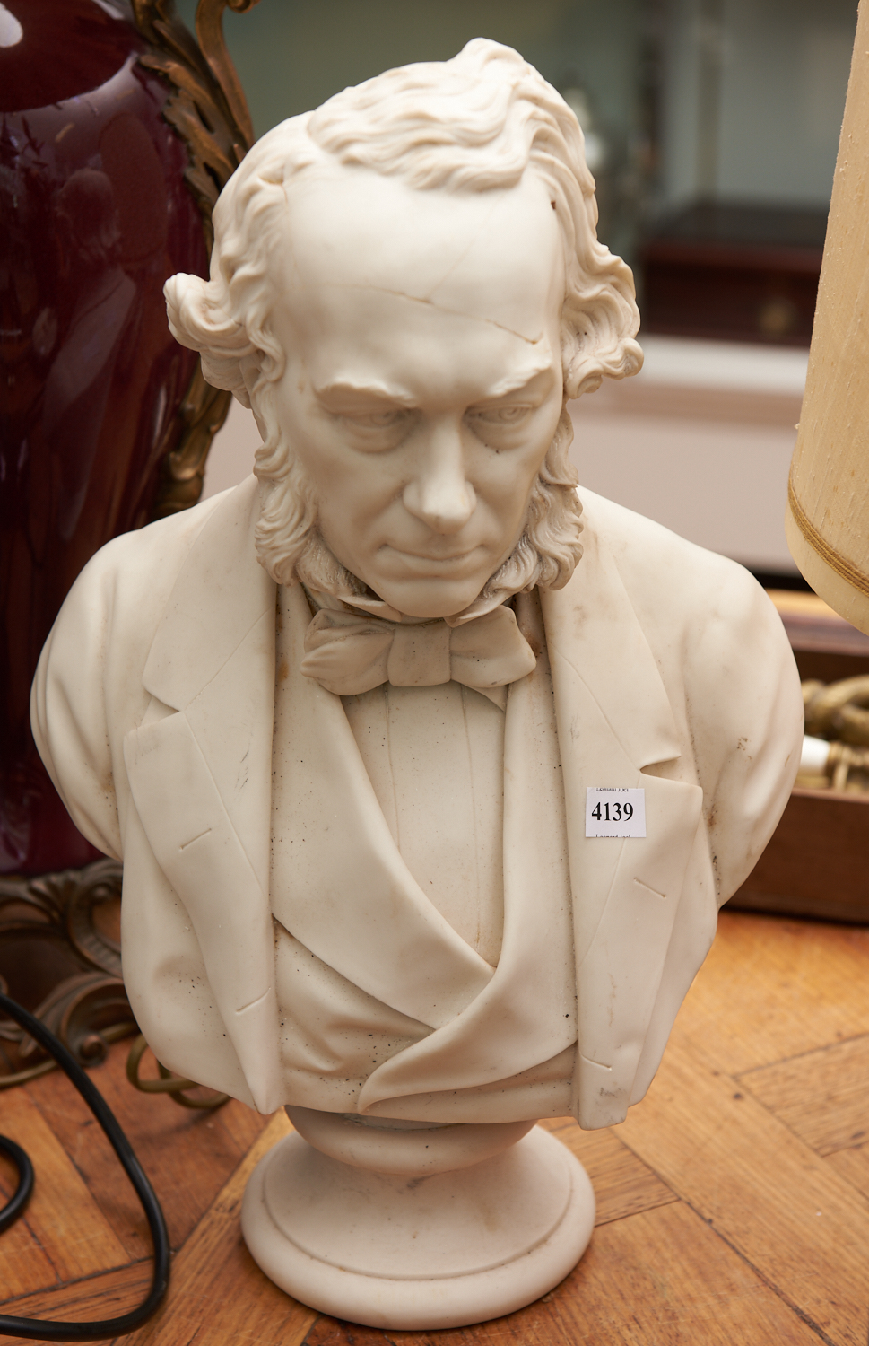 A VICTORIAN PARIAN BUST OF RICHARD COBDEN ESQ. MP, PUBLISHED BY JOHN STARK, MANUFACTURED BY ROBINSON & LEADBEATTER, STOKE ON TRENT, (A/F, SIGNIFICANT REPAIRS AND LOSSES TO HEAD), LEONARD JOEL LOCAL DELIVERY SIZE: SMALL. The Estate of Rodney Permezel