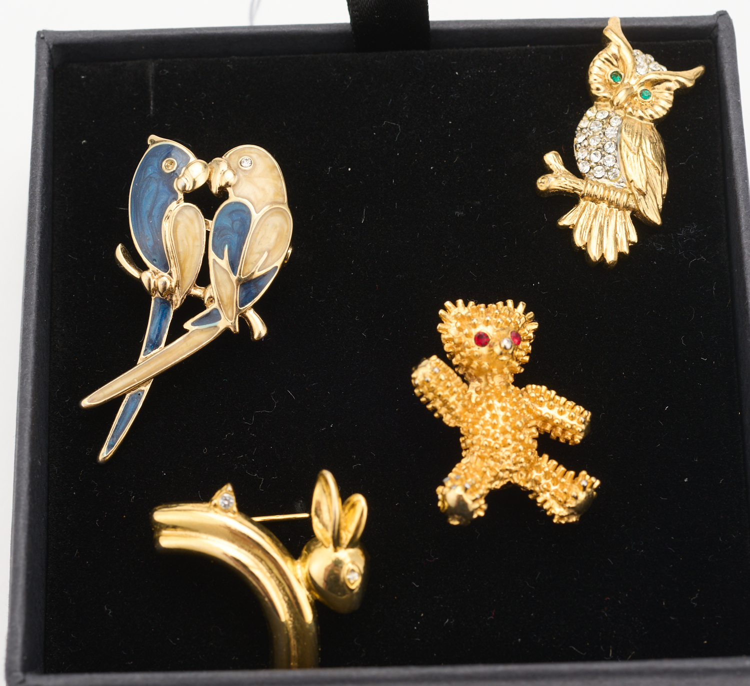 A COLLECTION OF FOUR COSTUME NOVELTY BROOCHES INCLUDING, TEDDY BEAR, OWL, BUNNY RABBIT & LOVE BIRDS.