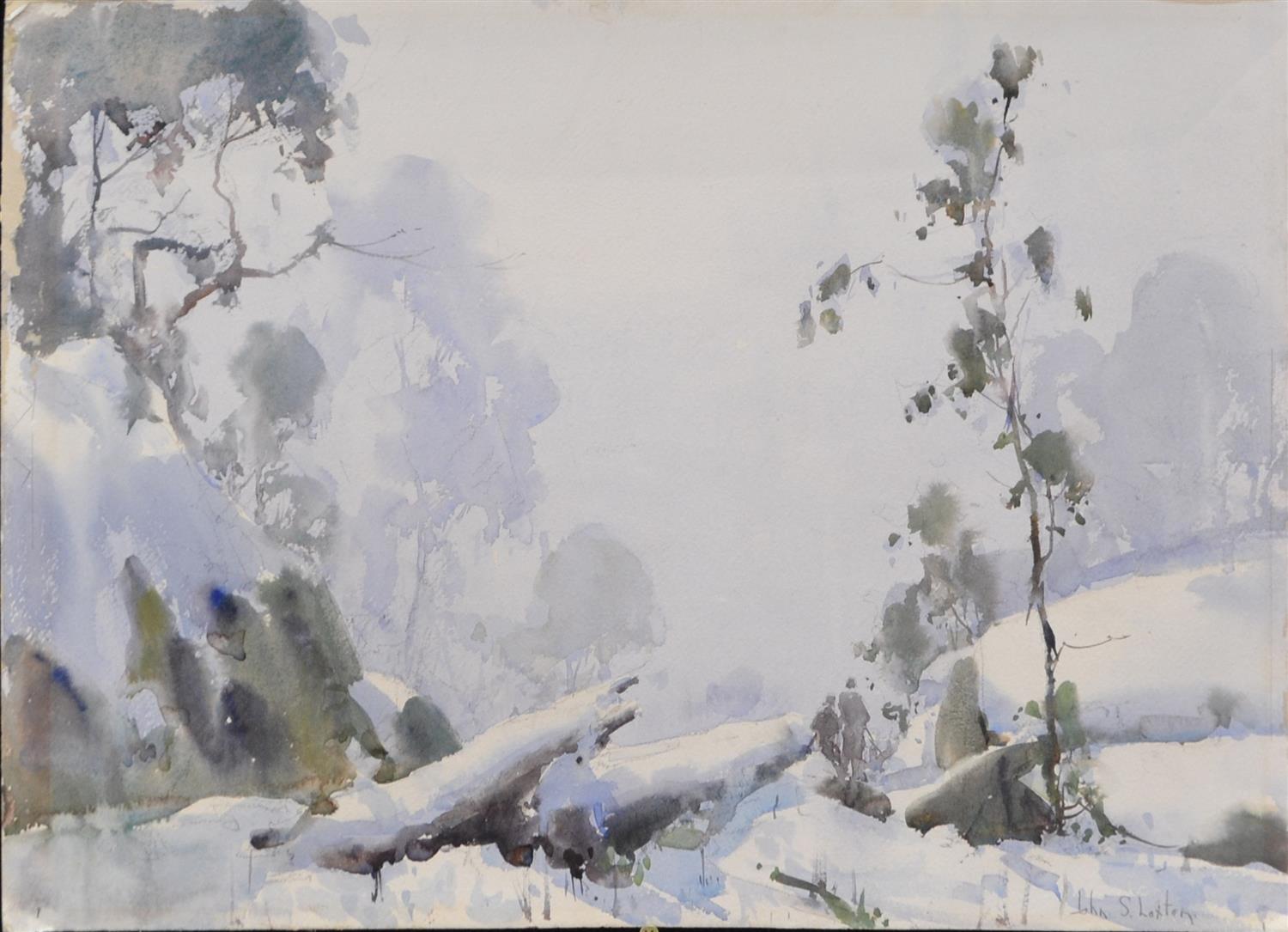 JOHN LOXTON, SNOWSCAPE, WATERCOLOUR ON PAPER, LAID ON BOARD, 39 X 53CM, CONDITION: THIS ARTWORK IS UNFRAMED, MINOR WEAR AND SURFACE SCRATCHES ARE APPARENT, MAINLY TO THE EDGES, LEONARD JOEL DELIVERY SIZE: MEDIUM