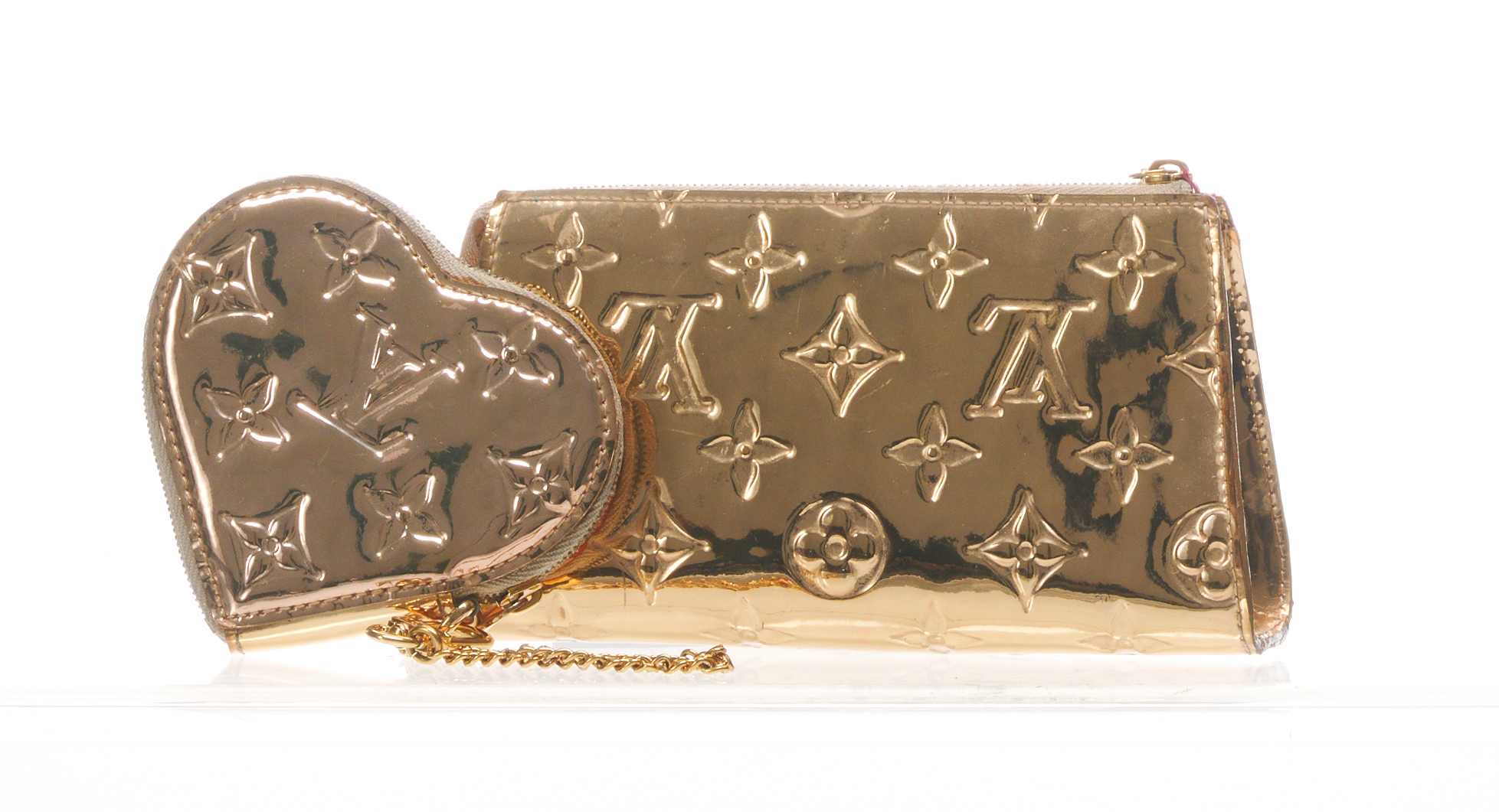 Styled in monogram gold mirror leather with gold metal hardware, the cosmetic pouch 17.5 x 10 x 5cm, the coin purse 10.5 x 9.5 x 1.3cm.