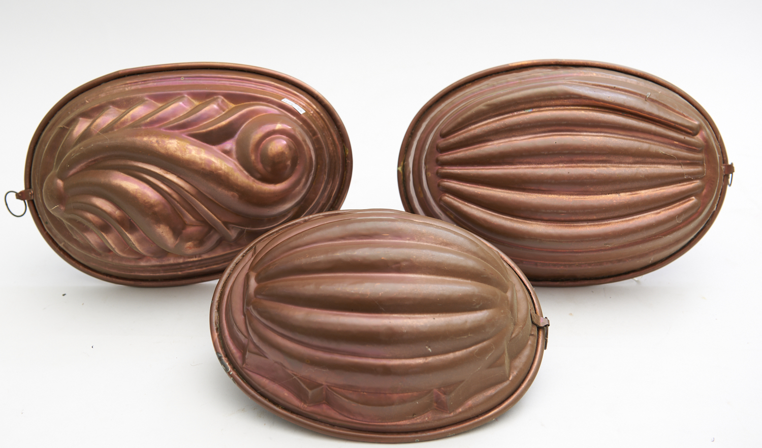 A GROUP OF THREE COPPER JELLY MOULDS (LARGEST W.30CM), LEONARD JOEL LOCAL DELIVERY SIZE: SMALL