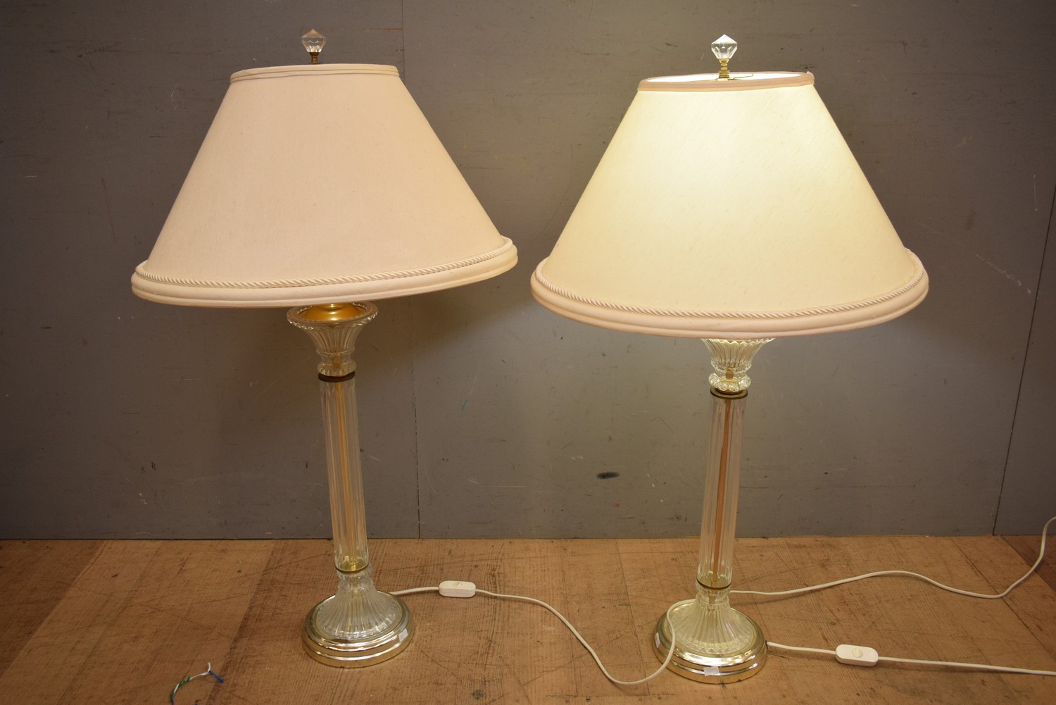 A PAIR OF ITALIAN GLASS AND PERSPEX TABLE LAMPS WITH CANVAS SHADES (A/F) (H92 CM) (LEONARD JOEL DELIVERY SIZE: MEDIUM)