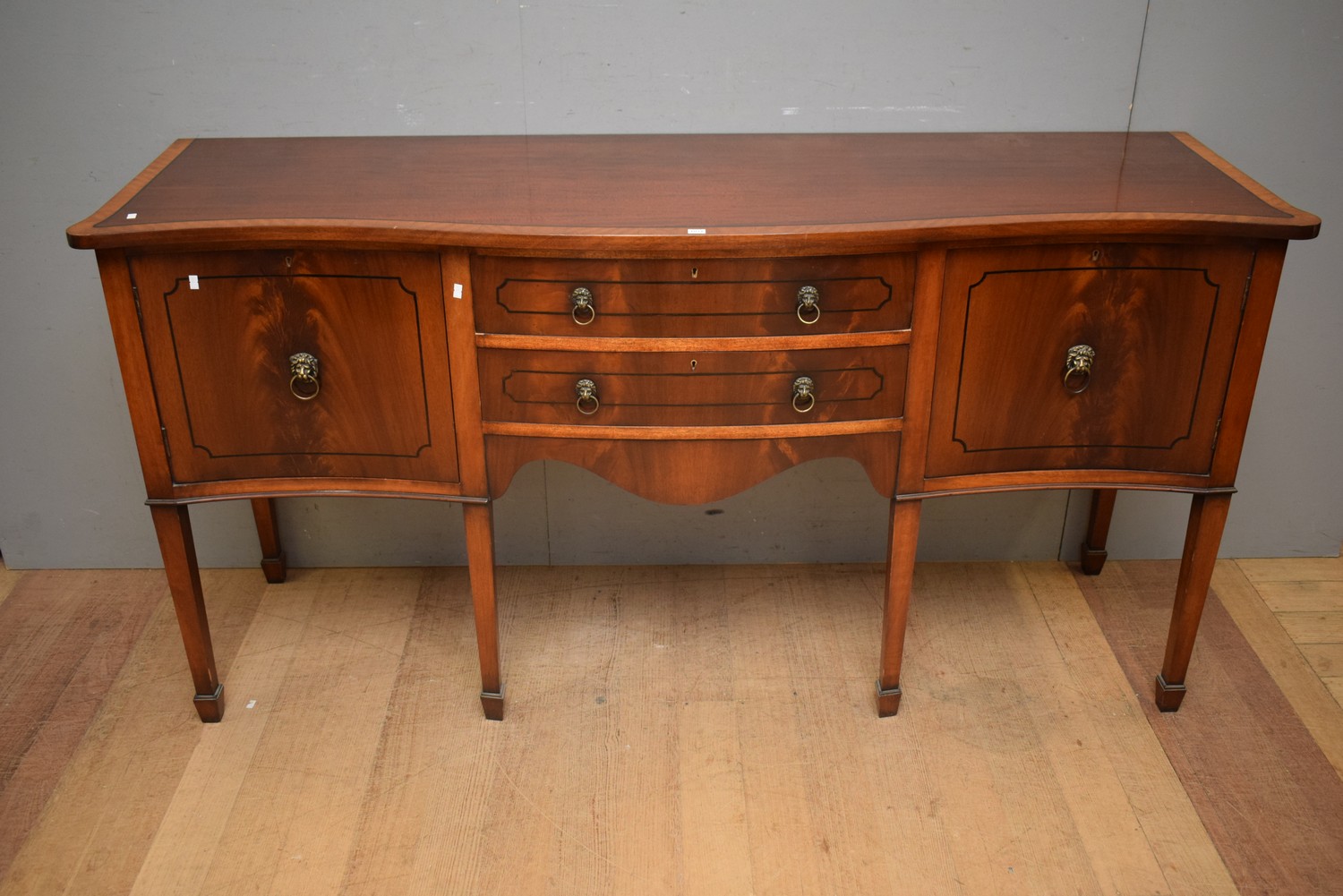 A SERPENTINE FRONT TIMBER INLAID SIDEBOARD WITH BRASS LION FORM HANDLES (A/F) (94H x 186W x 57D CM) (PLEASE NOTE THIS HEAVY ITEM MUST BE REMOVED BY CARRIERS AT THE CUSTOMER'S EXPENSE. LEONARD JOEL STAFF CANNOT ASSIST CARRYING THIS ITEM) (X-LARGE ITEM)