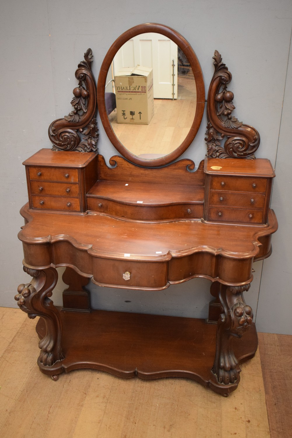 A DECORATIVELY CARVED TIMBER DRESSING TABLE (163H x 127W x 61D CM) (A/F) (PLEASE NOTE THIS HEAVY ITEM MUST BE REMOVED BY CARRIERS AT THE CUSTOMER'S EXPENSE. LEONARD JOEL STAFF CANNOT ASSIST CARRYING THIS ITEM) (X-LARGE ITEM)