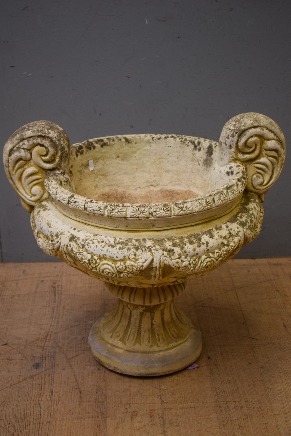 A VINTAGE INTRICATELY FORMED CONCRETE GARDEN URN (H52 X W55 CM) (PLEASE NOTE THIS HEAVY ITEM MUST BE REMOVED BY CARRIERS AT THE CUSTOMER'S EXPENSE. LEONARD JOEL STAFF CANNOT ASSIST CARRYING THIS ITEM) (X-LARGE ITEM)