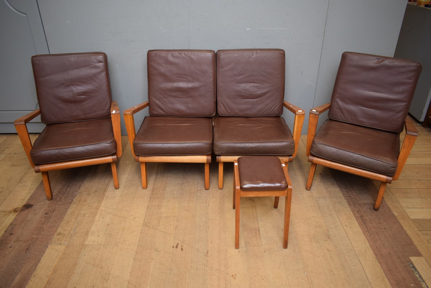 A FIVE PIECE AUSTRALIAN LEATHER 1960S LOUNGE SUITE, COMPRISING TWO ARMCHAIRS A TWO SEATER SETTEE AND A FOOTSTOOL (ARMCHAIR 87H x 67W x 79D CM) (PLEASE NOTE THIS HEAVY ITEM MUST BE REMOVED BY CARRIERS AT THE CUSTOMER'S EXPENSE. LEONARD JOEL STAFF CANNOT ASSIST CARRYING THIS ITEM) (X-LARGE ITEM)