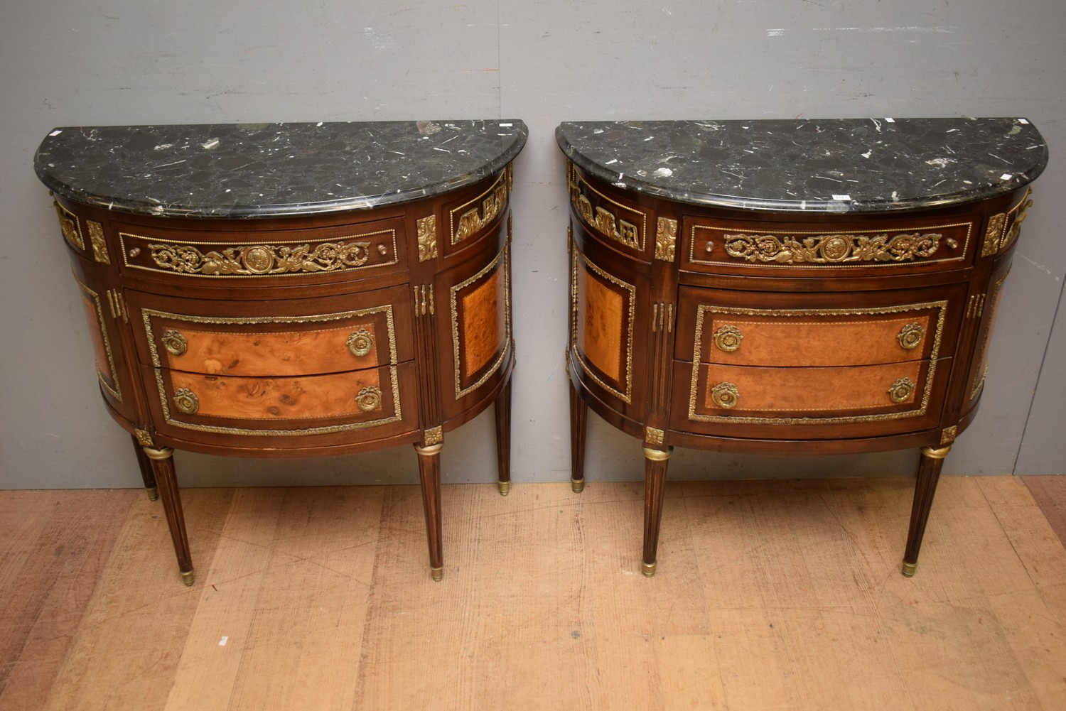 A MATCHING PAIR OF LOUIS XVI STYLE DEMILUNE BEDSIDE CHESTS WITH THREE DRAWERS AND MARBLE TOP (83H x 86W x 37D CM) (LEONARD JOEL DELIVERY SIZE: LARGE)