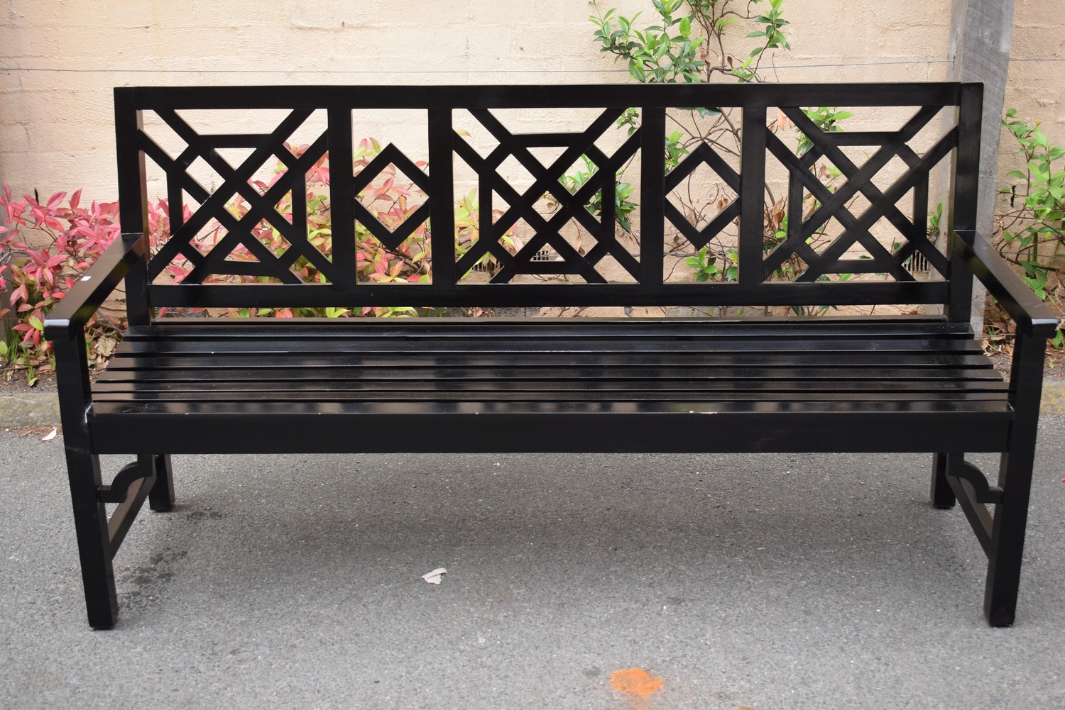 A BLACK LACQUERED WATERPROOF TEAK BENCH SEAT (H95 X W180 X D64 CM) (LEONARD JOEL DELIVERY SIZE: LARGE)