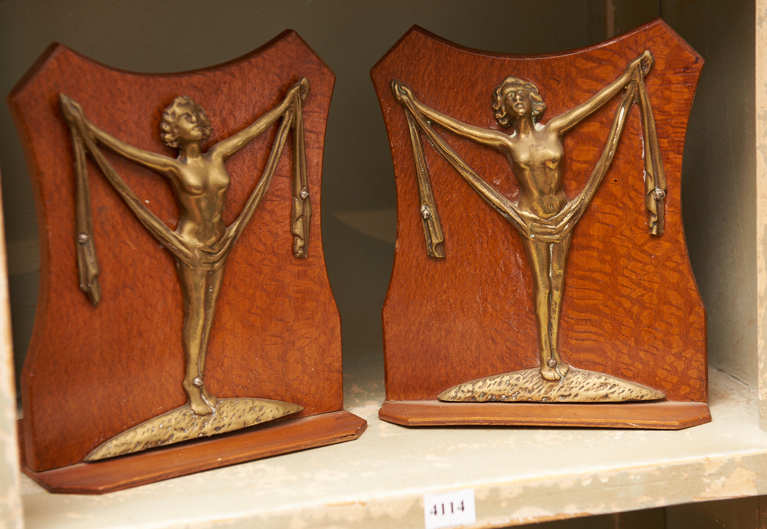 A PAIR OF WOODEN BOOKENDS WITH FIGURAL BRASS DECORATION (22 CM H), LEONARD JOEL LOCAL DELIVERY SIZE: SMALL