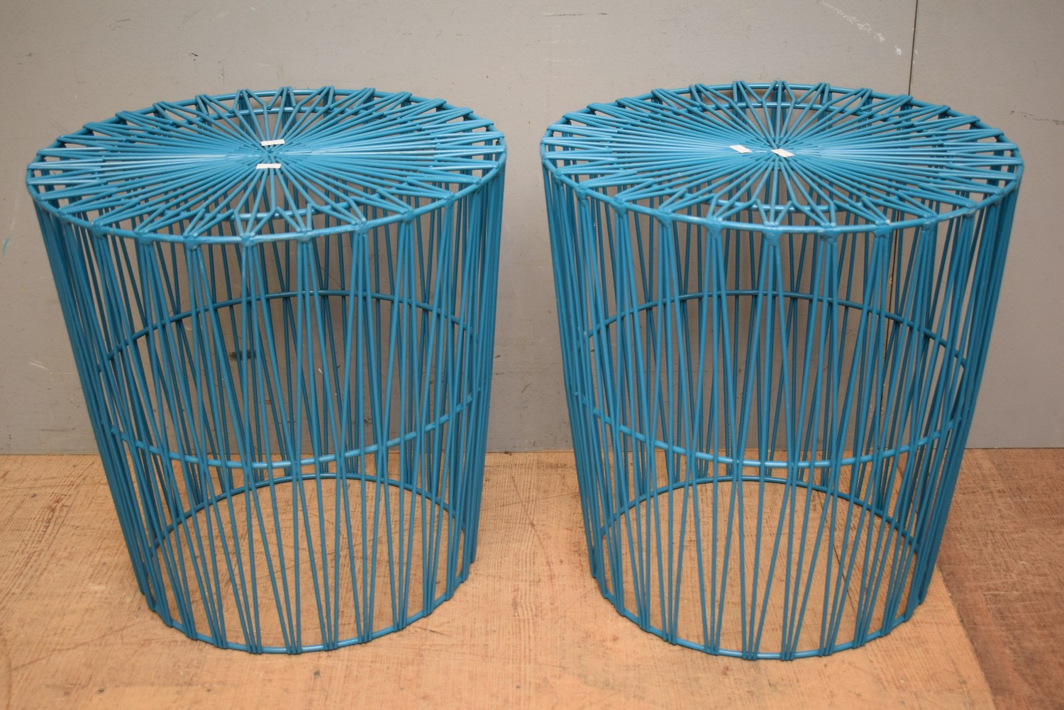 A PAIR OF TEAL METAL SIDE TABLES (H46 X D46 CM) (LEONARD JOEL DELIVERY SIZE: MEDIUM)
