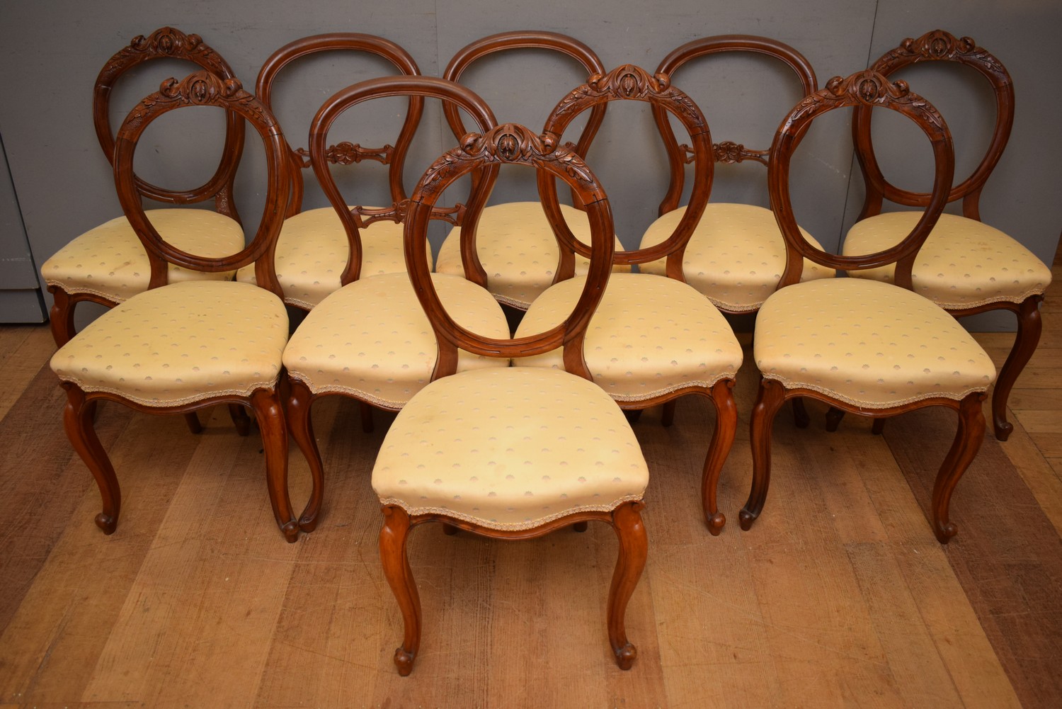 A SET OF TEN BALLOON BACK DINING CHAIRS (A/F) (H89 X W49 X D53 CM) (LEONARD JOEL DELIVERY SIZE: LARGE)