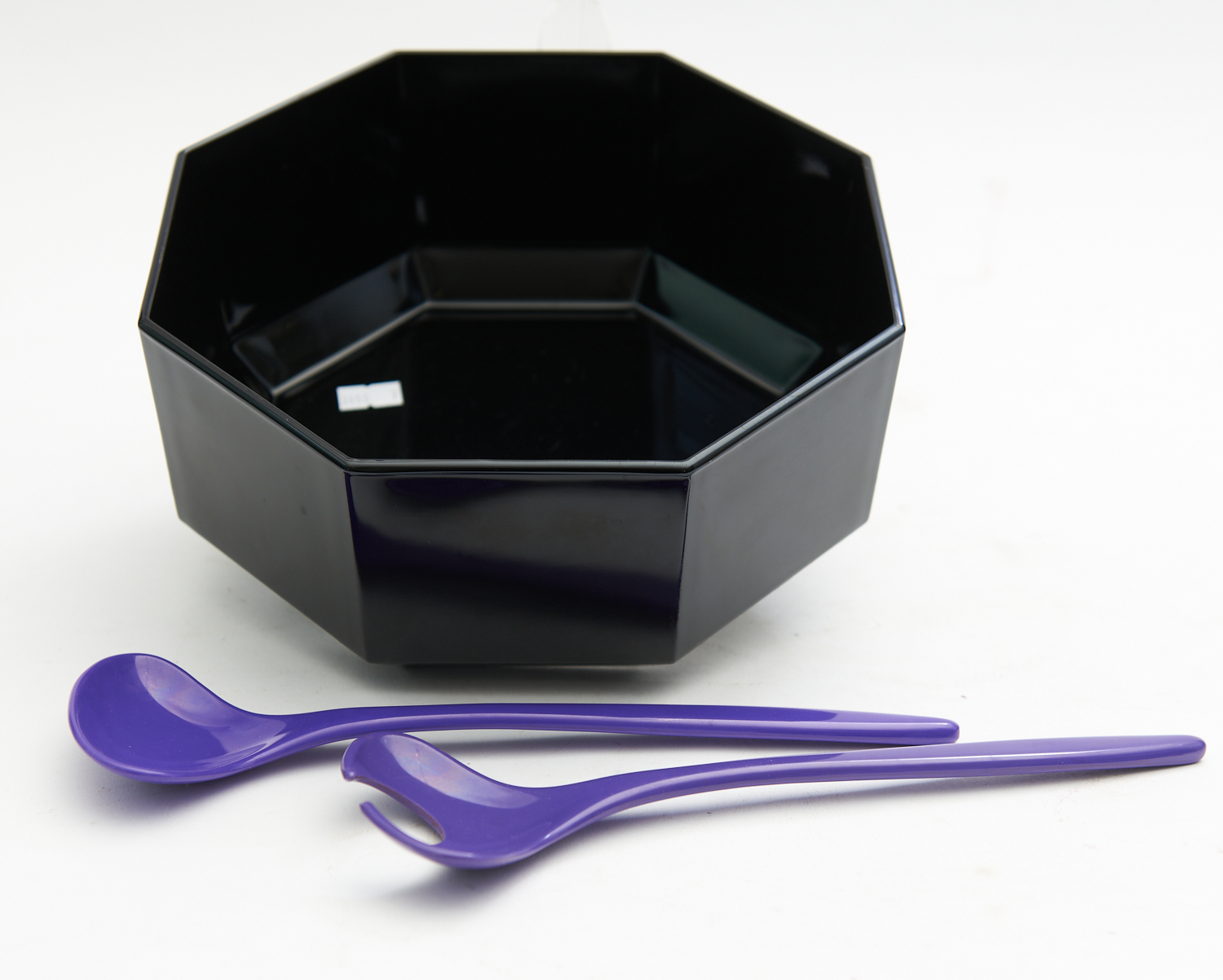 A FRENCH BLACK GLASS OCTAGONAL SALAD BOWL WITH PURPLE MELAMINE SALAD SERVERS (23 CM D), LEONARD JOEL LOCAL DELIVERY SIZE: SMALL