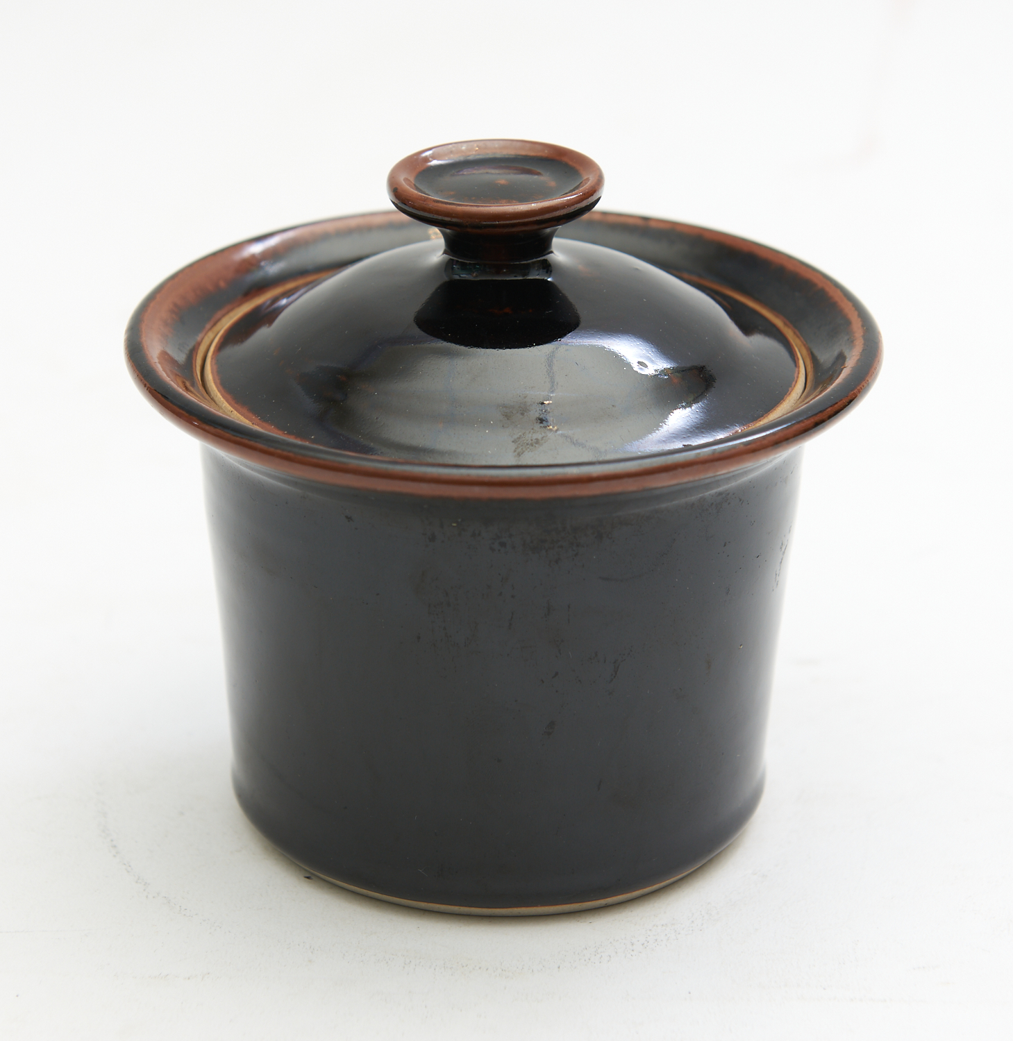 AN AUSTRALIAN POTTERY LIDDED BOWL WITH TENMOKU GLAZE BY HAROLD HUGHAN (13 CM H), LEONARD JOEL LOCAL DELIVERY SIZE: SMALL