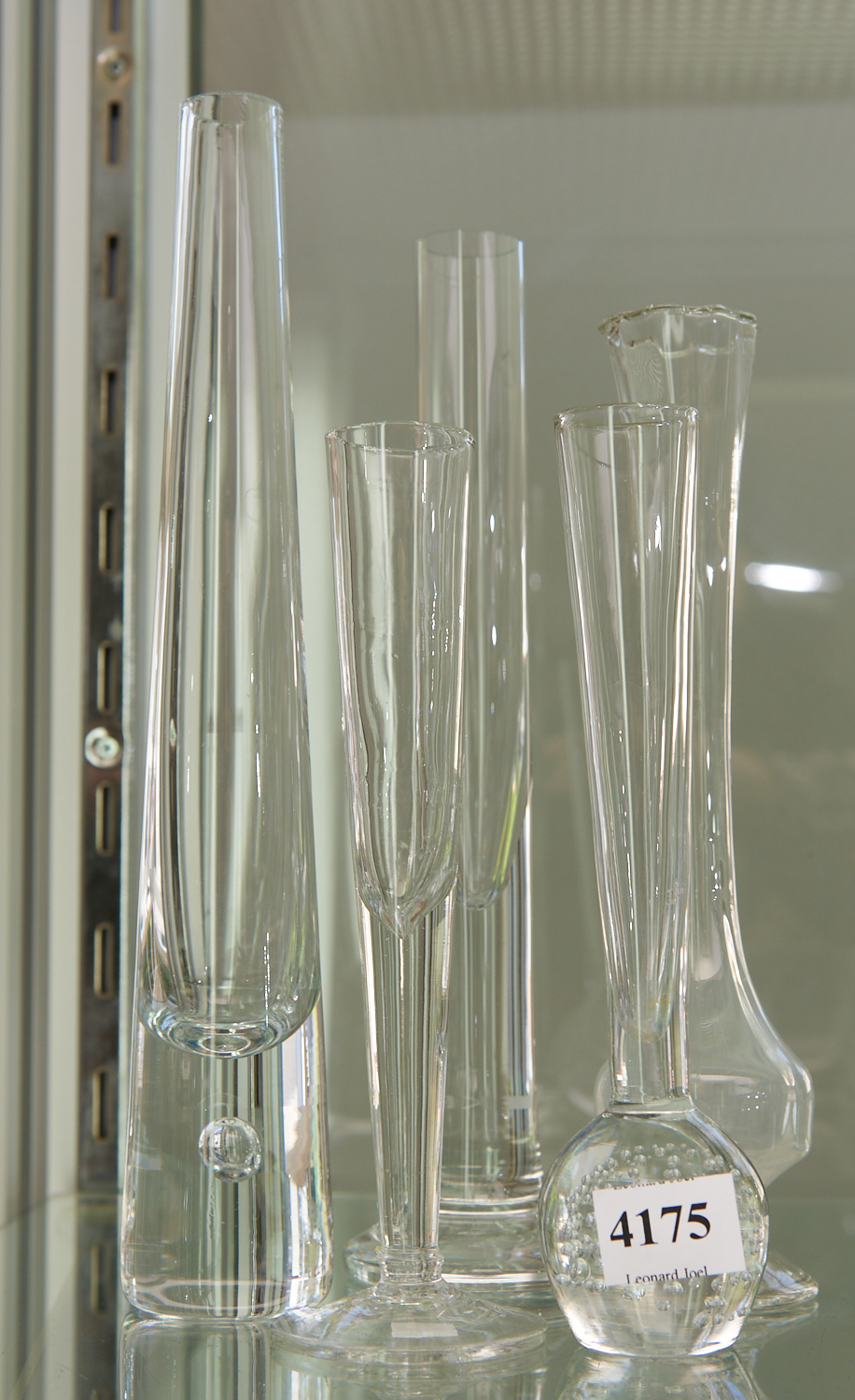 FIVE MID-CENTURY CLEAR GLASS BUD VASES (26 CM HIGHEST), LEONARD JOEL LOCAL DELIVERY SIZE: SMALL