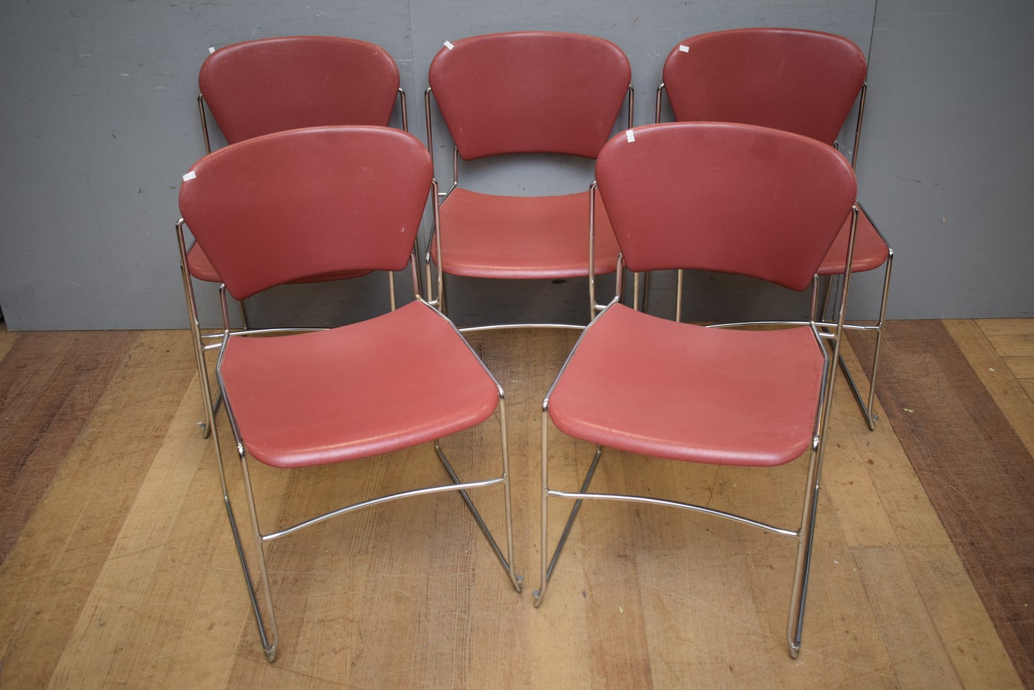 A SET OF FIVE CHARLES PERRY USA CHAIRS (A/F) (H81 X W51 X D54 CM) (LEONARD JOEL DELIVERY SIZE: LARGE)
