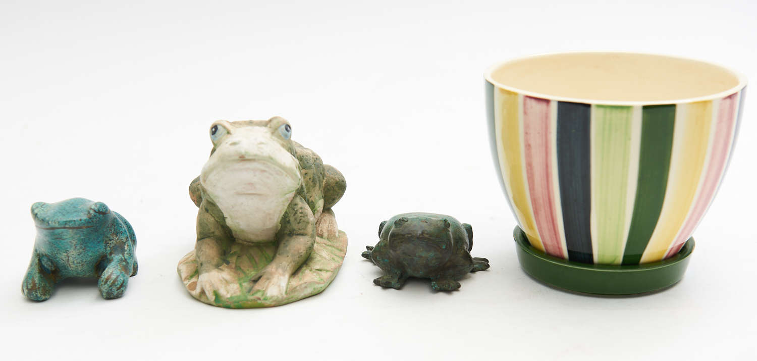 A DIANA PLANTER TOGETHER WITH THREE FROGS, CERAMIC, METAL AND STONE, LEONARD JOEL LOCAL DELIVERY SIZE: SMALL