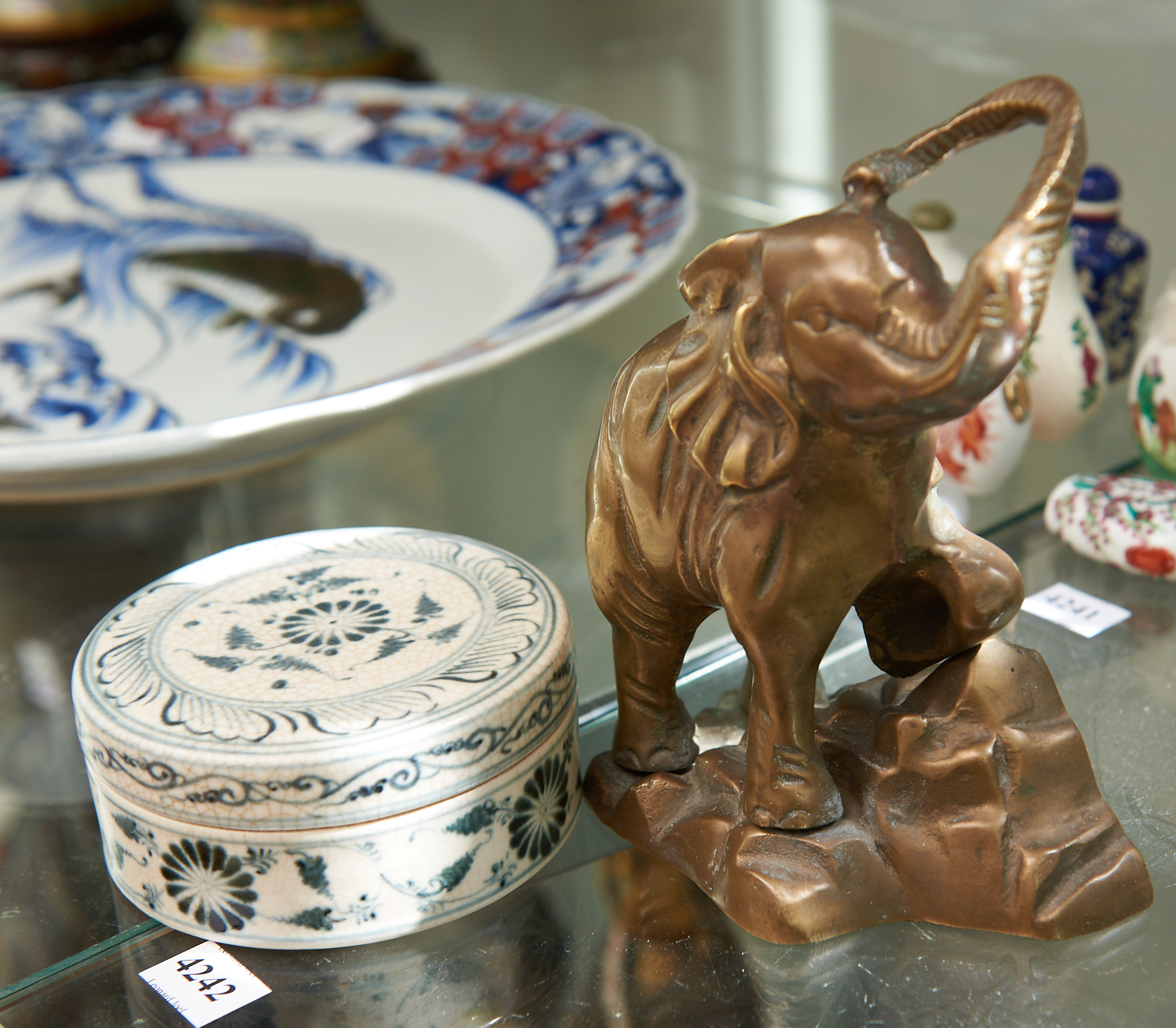 ART DECO BRASS ELEPHANT BOOKEND TOGETHER WITH CERAMIC LIDDED POT, LEONARD JOEL LOCAL DELIVERY SIZE: SMALL