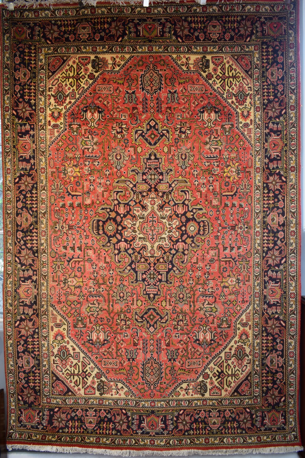 A BEAUTIFUL1960'S PERSIAN TABRIZ MARAND CARPET. 100% WOOL VINTAGE PILE. IN MELLOW COLOURS.  GOOD CLEAN CONDITION RESTORED CLASSIC DESIGN OF BOLD FLORAL MEDALLION AND QUARTERED CORNER MEDALLIONS CONTAINING FLORAL SHRUBS IN A CREAM FIELD OF MOTIFS. BORDER OF ROSETTES AND FLOWERS.  CERTIFICATE OF AUTHENTICITY INCLUDED.  SIZE: 299X200CM ORIGIN: IRAN - RRP: $3,200