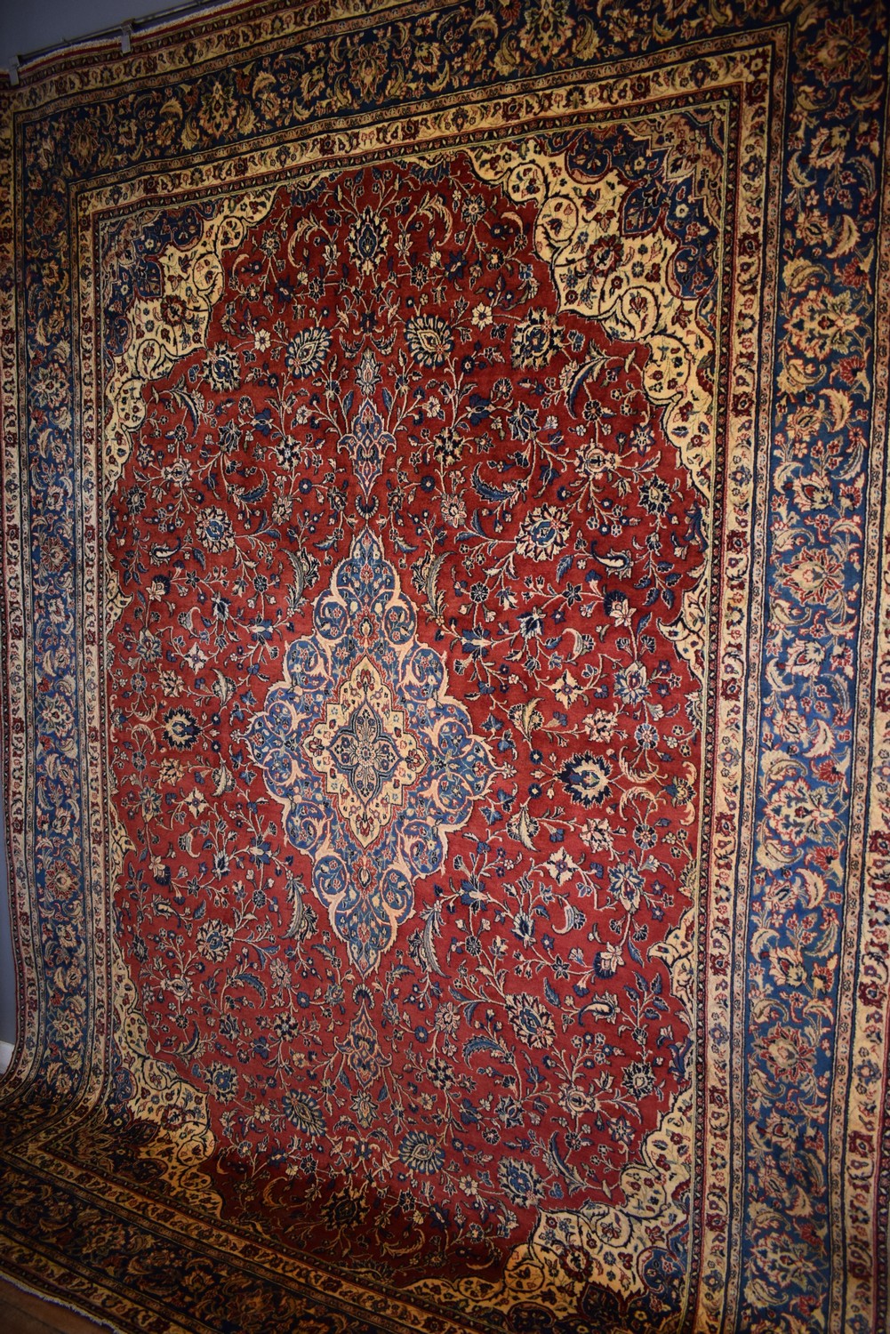 A FINE CIRCA 1970s PERSIAN SHAHBAFAT CARPET. 100% WOOL PILE. SOLID AND DENSE. IN GOOD CLEAN CONDITION. BEAUTIFUL CENTRAL MEDALLION IN SKY BLUE, PALMETTES, SAZ LEAVES & FLOWER HEADS ON A RED BACKGROUND. BORDER OF PALMETTES & SAZ LEAVES IN ROYAL BLUE. SOME RESTORATION. CERTIFICATE OF AUTHENTICITY INCLUDED. SIZE: 383X275CMORIGIN: IRAN - RRP: $3,800