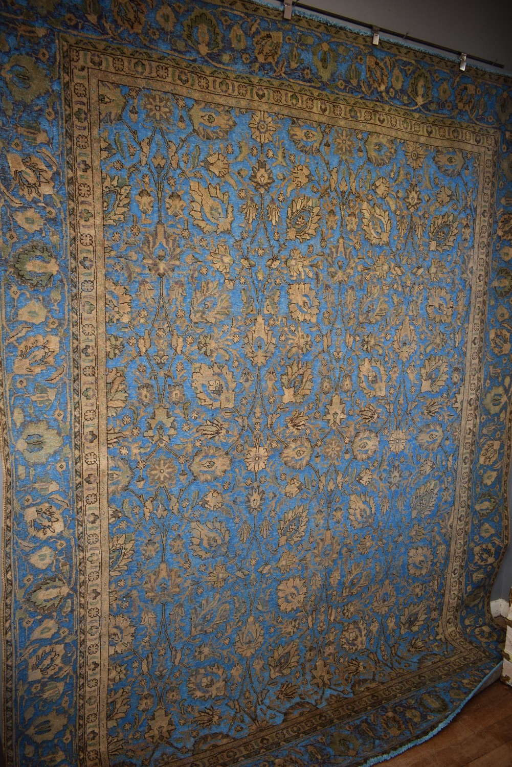 AN EXCEPTIONAL CONTEMPORARY VINTAGE OVER-DYED PERSIAN TABRIZ CARPET. A UNIQUE MODERN CARPET CREATED FROM AN AUTHENTIC VINTAGE MEDALLION DESIGN TABRIZ CARPET WITH THE PILE SHORN AND OVER-DYED IN TURQUOISE BLUE, GOLD AND TAN TONES. GALLERY EXHIBITED. AS SEEN IN HARPERS BAZAAR. CERTIFICATE OF AUTHENTICITY INCLUDED. SIZE: 361X282CM ORIGIN: PERSIA - RRP: $7,900
