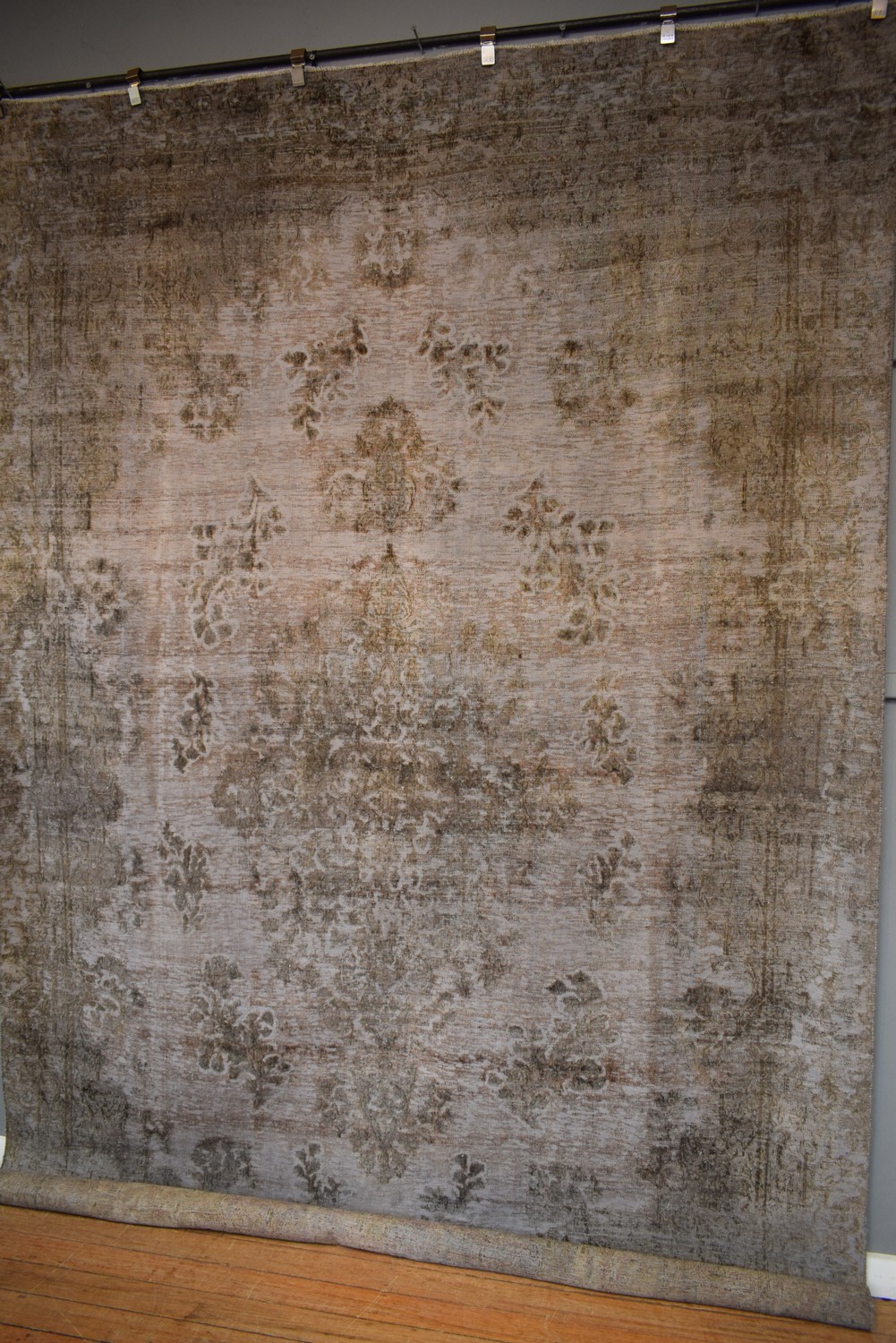A MAGNIFICENT SUPERFINE MODERN VINTAGE OVER-DYED PERSIAN KERMAN CARPET, VINTAGE PILE. A ONE-OF-A-KIND MODERN CARPET CREATED FROM AN AUTHENTIC VINTAGE MEDALLION DESIGN KERMAN CARPET WITH THE PILE SHORN. THE ENTIRE IS OVER-DYED IN OLIVE, GREY&LIGHT BLUE TONES. GALLERY EXHIBITED. EXCELLENT CONDITION. CERTIFICATE OF AUTHENTICITY INCLUDED. SIZE: 375X246CM ORIGIN: PERSIA - RRP: $8,900