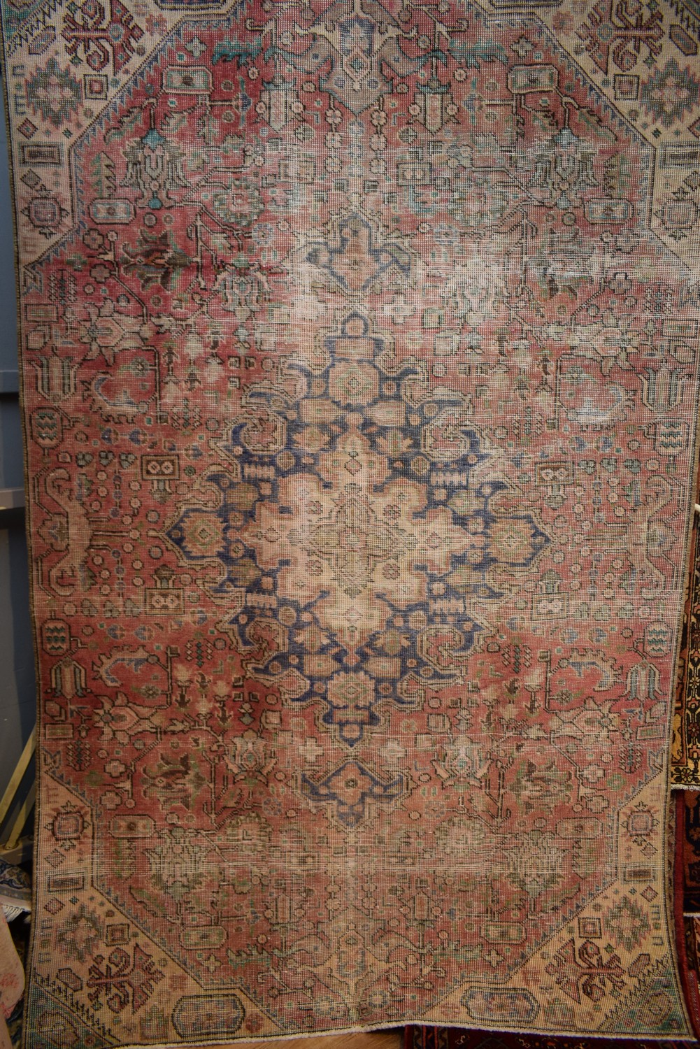 A VINTAGE OVER-DYED PERSIAN TABRIZ CARPET. VINTAGE PILE. A UNIQUE & INDIVIDUAL MODERN CARPET CREATED FROM AN AUTHENTIC FINELY HAND-KNOTTED VINTAGE PERSIAN TABRIZ CARPET WITH CLASSIC MEDALLION DESIGN. THE PILE IS SHORN IN TONES OF BLUE, RED & BEIGE. CERTIFICATE OF AUTHENTICITY INCLUDED. SIZE: 252X159CM ORIGIN: PERSIA - RRP: $3,300