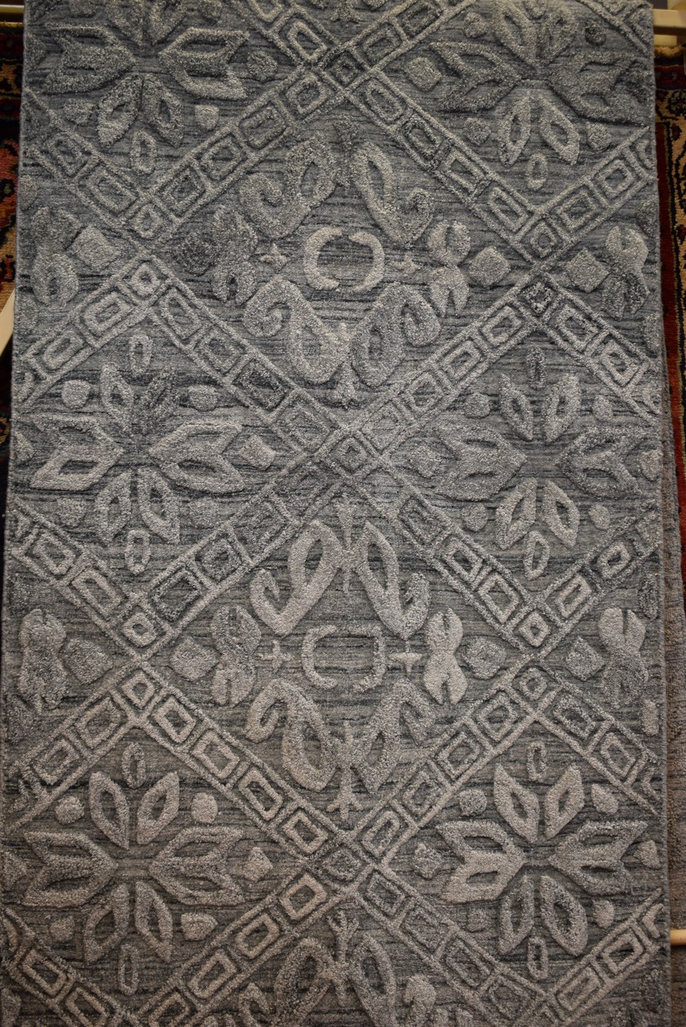 A MODERN HAND LOOMED MOROCCAN STYLE RUNNER.ERASED DIAMOND SHAPED PATTERN, SOLID AND DENSE. BRAND NEW. IN TONES OF GREY, LIGHT GREEN AND CREAM. SIZE: 412X85CM ORIGIN: INDIA - RRP: $1,500