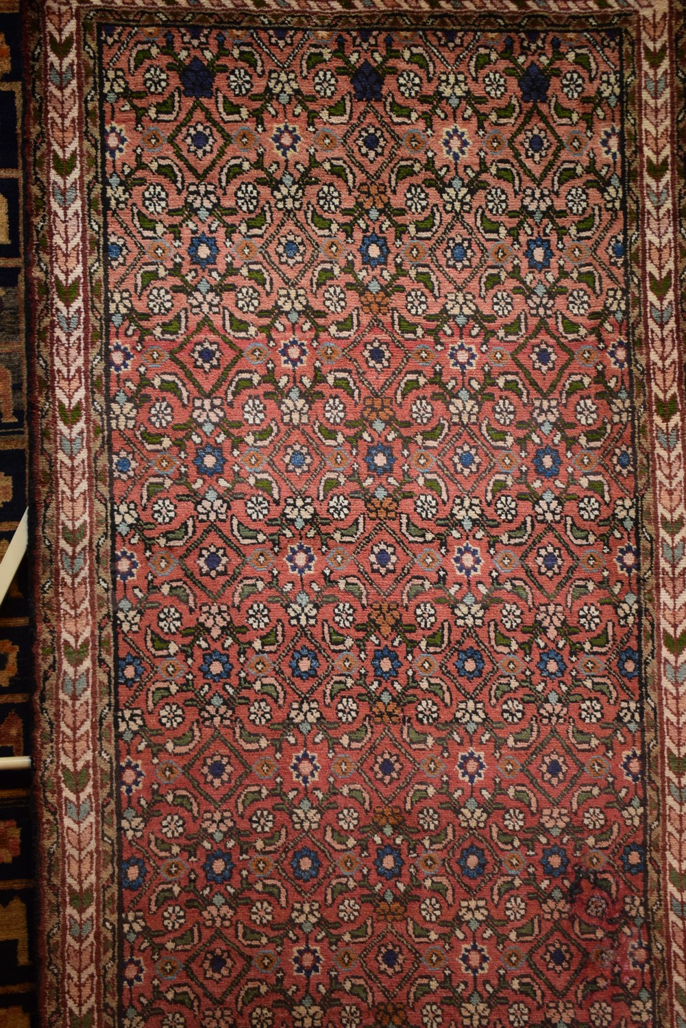 A PERSIAN HAMADAN HALL RUNNER. 100% WOOL. DENSE PILE. EX-GALLERY STOCK. IN EXCELLENT CONDITION. HAND-KNOTTED HAMADAN VILLAGE WEAVE WITH DESIGN OF ALL-OVER FLORAL SPRAYS IN BLUE, CREAM AND GREEN & ROSETTES SET WITHIN A RED FIELD. CERTIFICATE OF AUTHENTICITY INCLUDED.SIZE: 296X110CM ORIGIN: PERSIA - RRP: $1,800